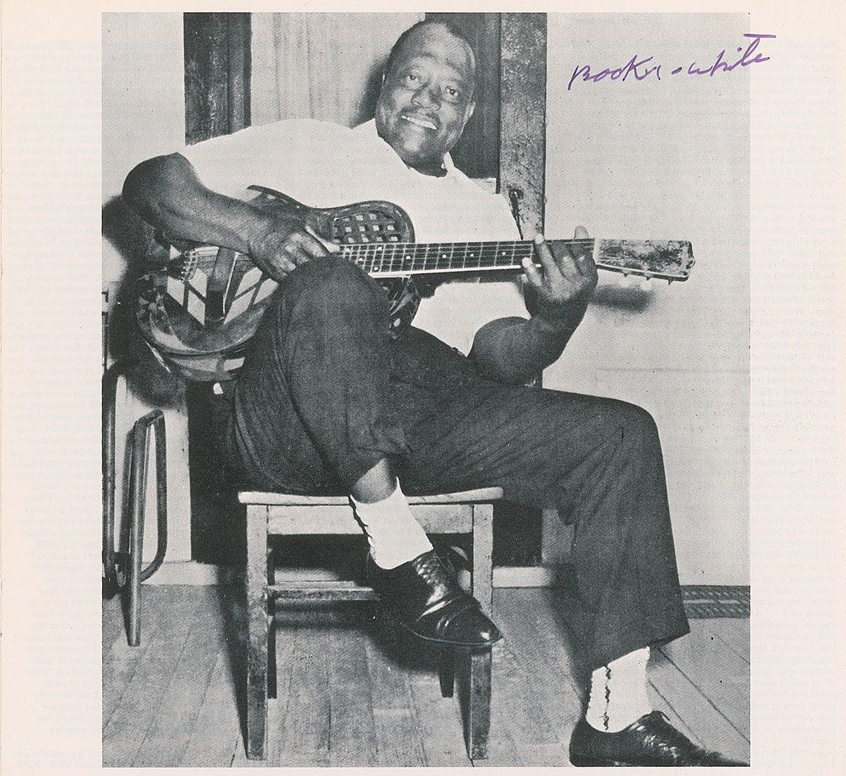 Uncommon 10.75 x 10 program photo of White playing one of his trademark resonator guitars, signed in black felt tip, “Booker White.” In fine condition.