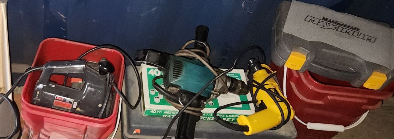 Skil 499 Jigsaw, B&D 7968-04 Planer, Makita Drill, Dewalt DW-100 Drill, B&D Work Wheel- Grey Toolbox 19 W, 9 D, 10 T