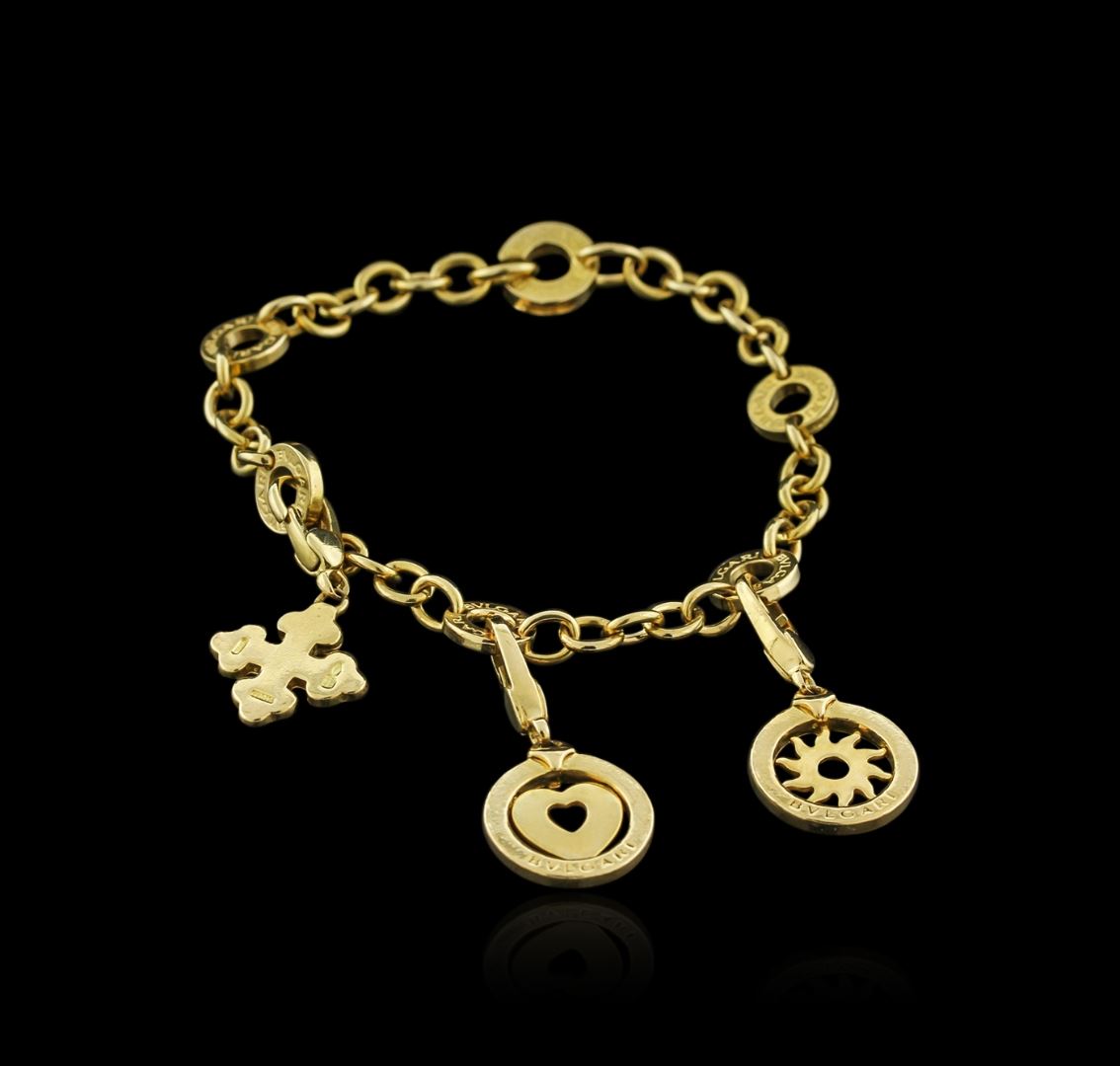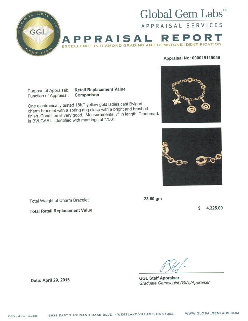 One electronically tested 18KT yellow gold ladies cast Bvlgari charm bracelet with a spring ring clasp with a bright and brushed finish. Measurements: 7" in length Trademark is BVLGARI. Identified with markings of "750". Condition is very good. Total Weight of Charm Bracelet 23.60 grams. GGL Appraised at $4,325.00.