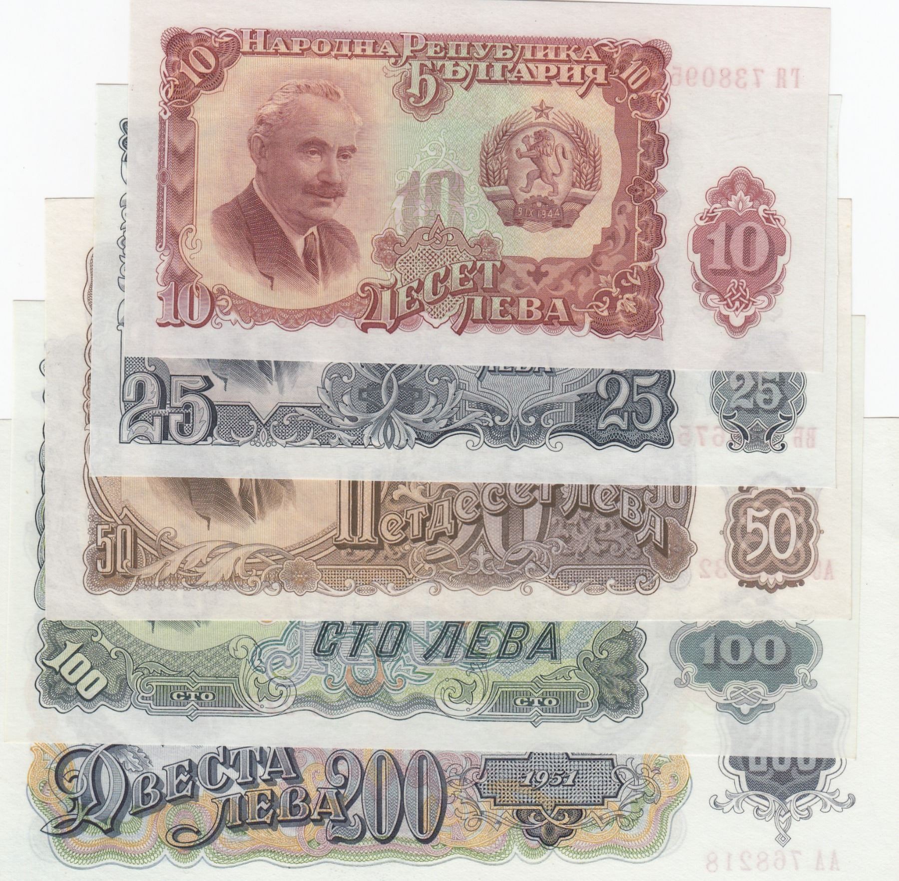 Bulgaria, 10 Leva, 25 Leva, 50 Leva, 100 Leva and 200 Leva, 1951, UNC, p83, p84, p85, p86, p87, (Tot