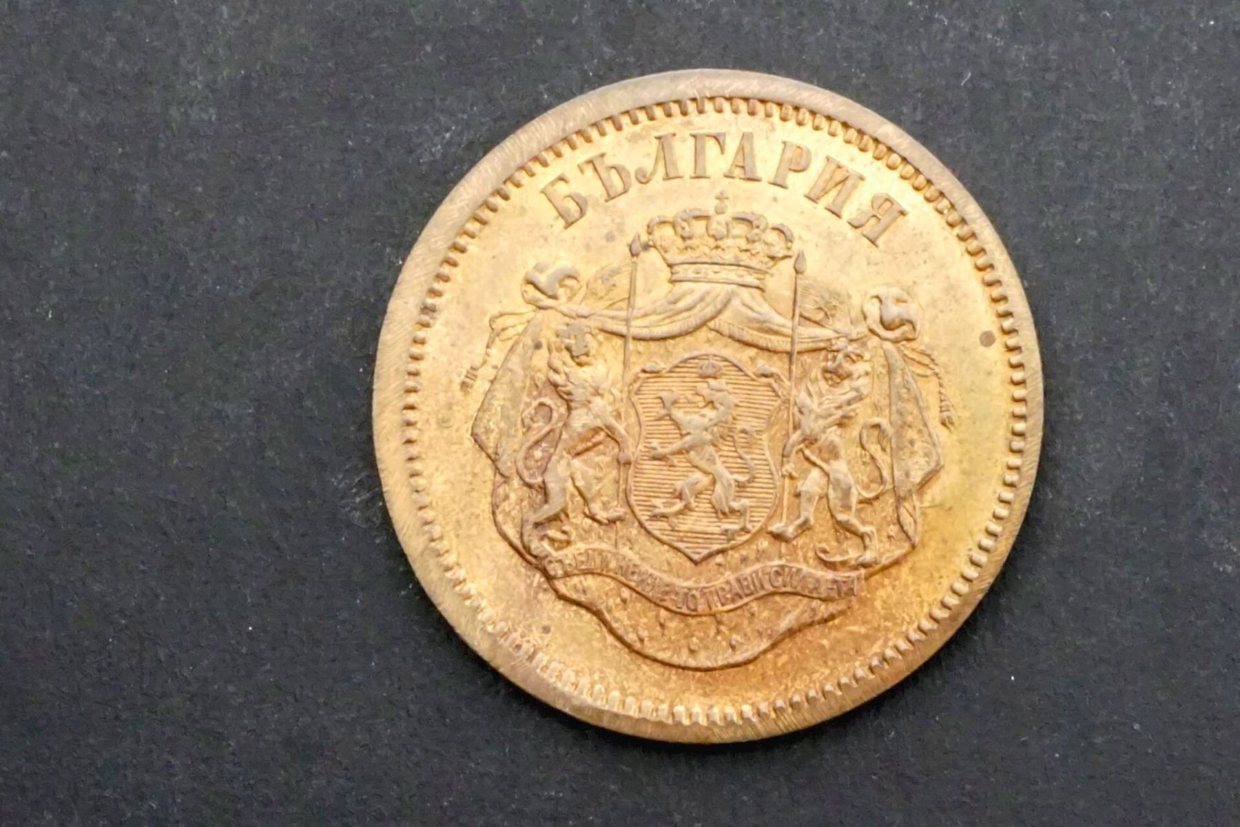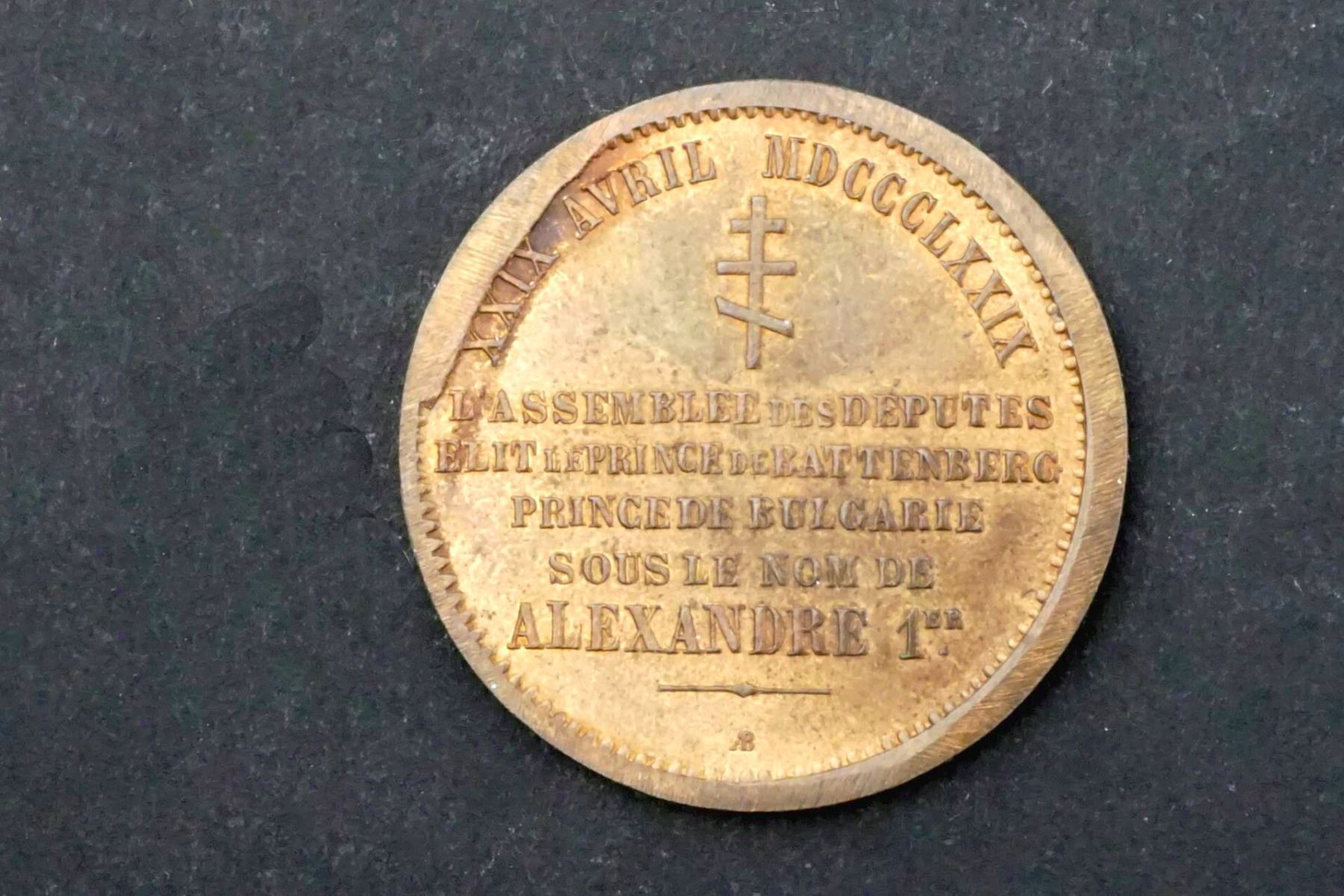 Copper, 30 mm, 9.0 grams. Obverse: BULGARIA (in Cyrillic) above the royal arms. Reverse: XXIX AVRIL MDCCCLXXIX, above three branches crosses L'ASSEMBLÉ DES DEPUTES / ELIT LE PRINCE DE BATTENBERG / PRINCE DE BULGARIE / SOUS LE NOM DE ALEXANDRE 1er. There is a major die break along the reverse rim between 9 and 11 o'clock, Condition is UNC, with glossy light brown surfaces. Scarce.