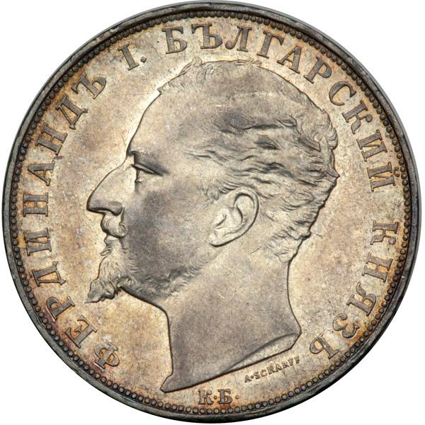 Bulgaria. 5 Leva, 1894-KB. Dav-61; KM-18. Ferdinand I as Prince. Bust left. Reverse: Value within wreath. Lightly toned with considerable luster. About Uncirculated.