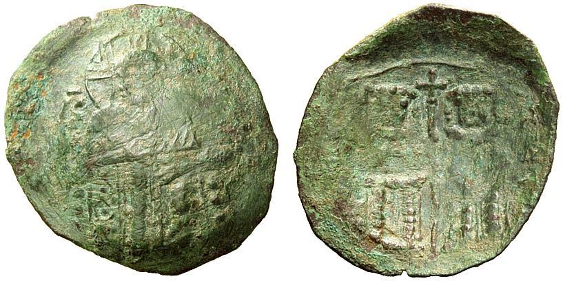Medieval European Coinage. Bulgaria. Georg Terter I, 1280-1292. Trachy, Tarnovo, Æ 2.24 g. Christ Pantokrator enthroned facing; in upper field, IC – XC. Rev. The Emperors standing facing, holding cross between them. Raduchev & Zekov type 1.7.1. Yokourova 51. Light green patina and good very fine
