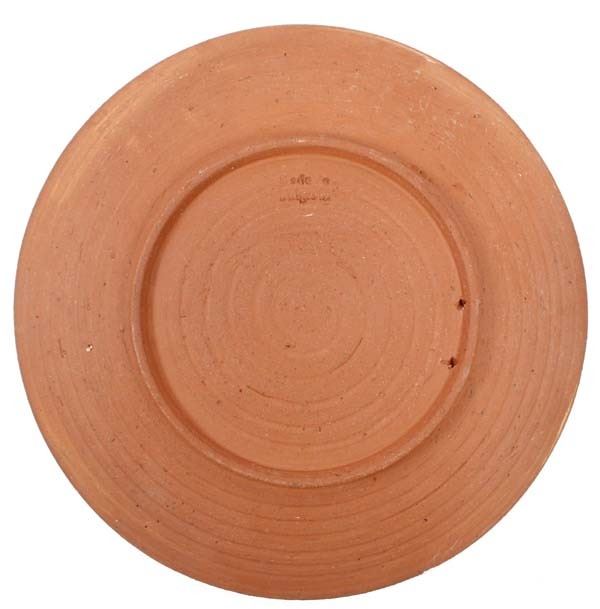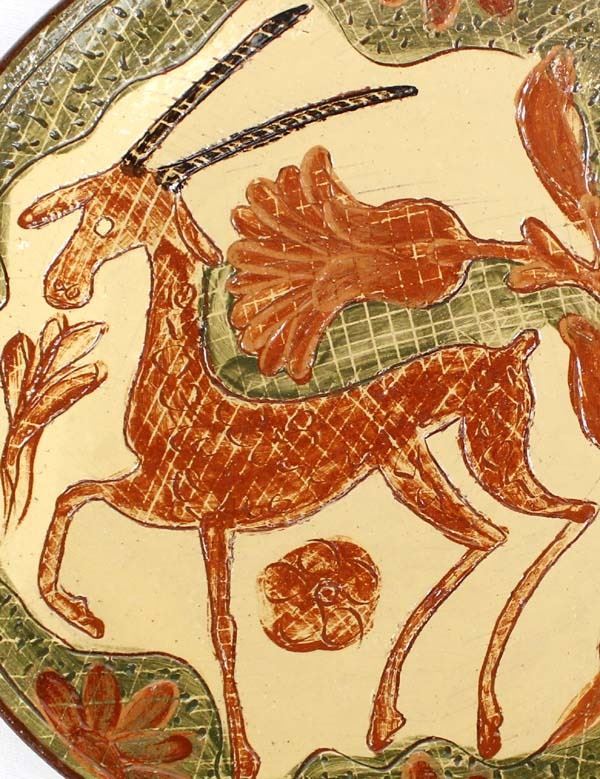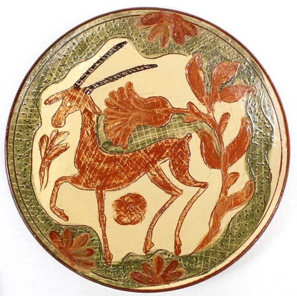 Bulgarian Ceramic Clay Pottery Ibex Plate, measures 11''D and is marked on the back, can be used as a plate or hung on the wall as there are 2 drilled holes in the back