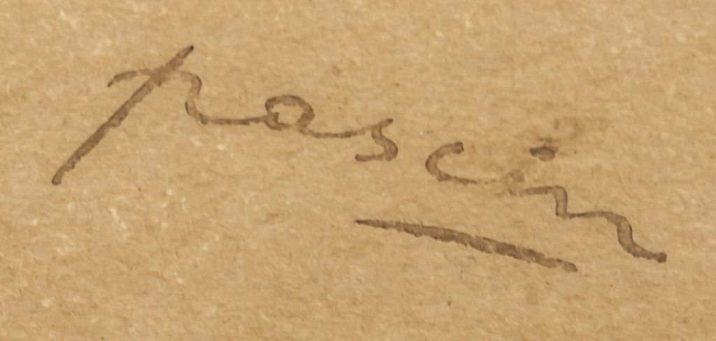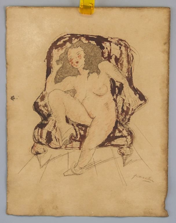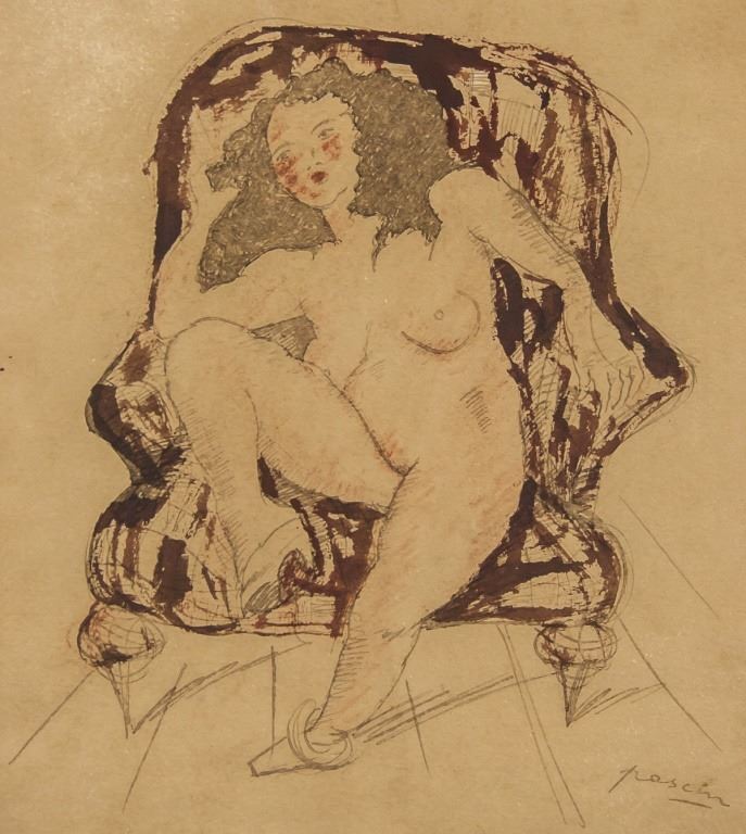 Ink and watercolor on paper. Featuring nude portrait of a woman sitting on an armchair. Signed "Pascin" to the bottom right. Two purple colored stamps on verso. 35 x 27 cm (13.7 x 10.7 inches).