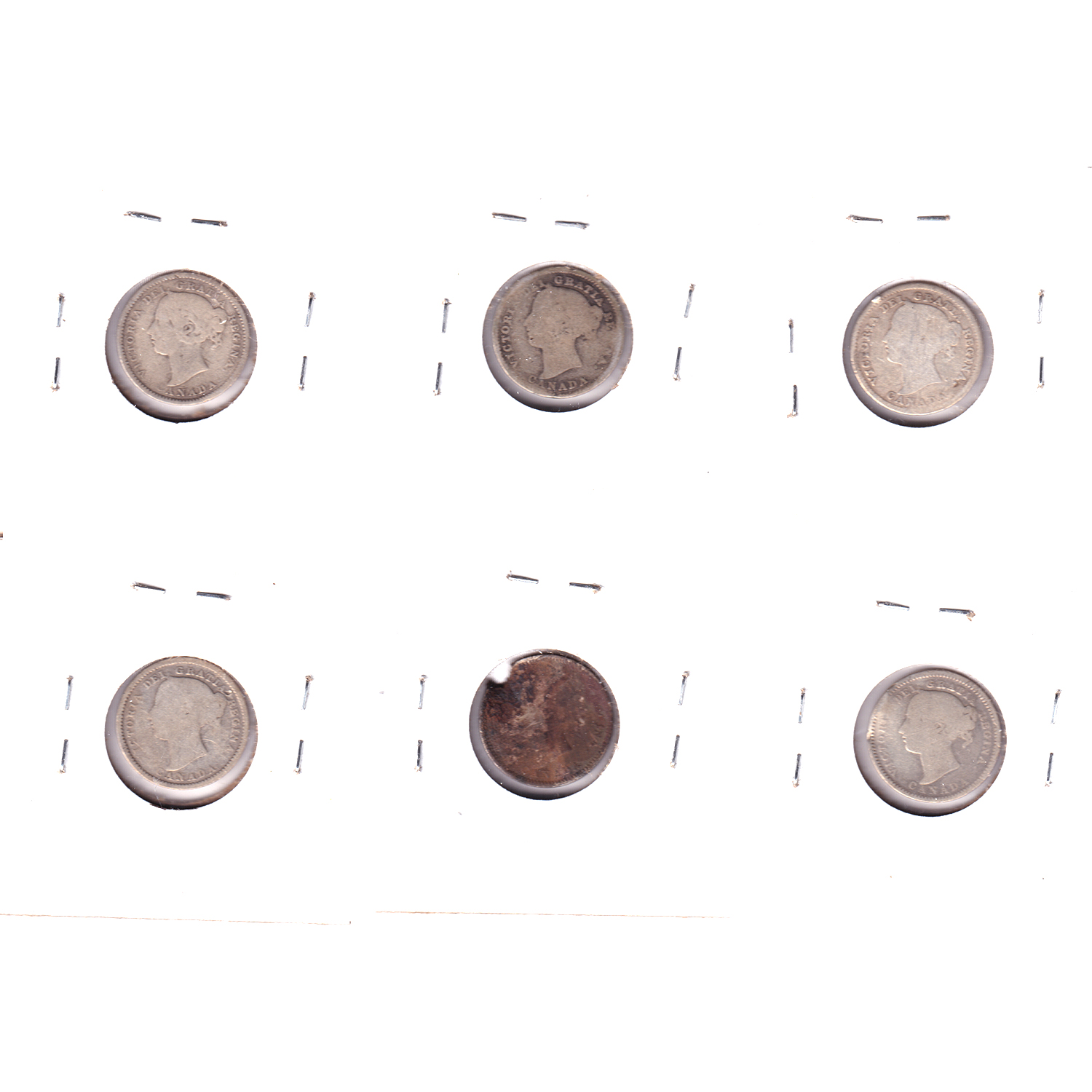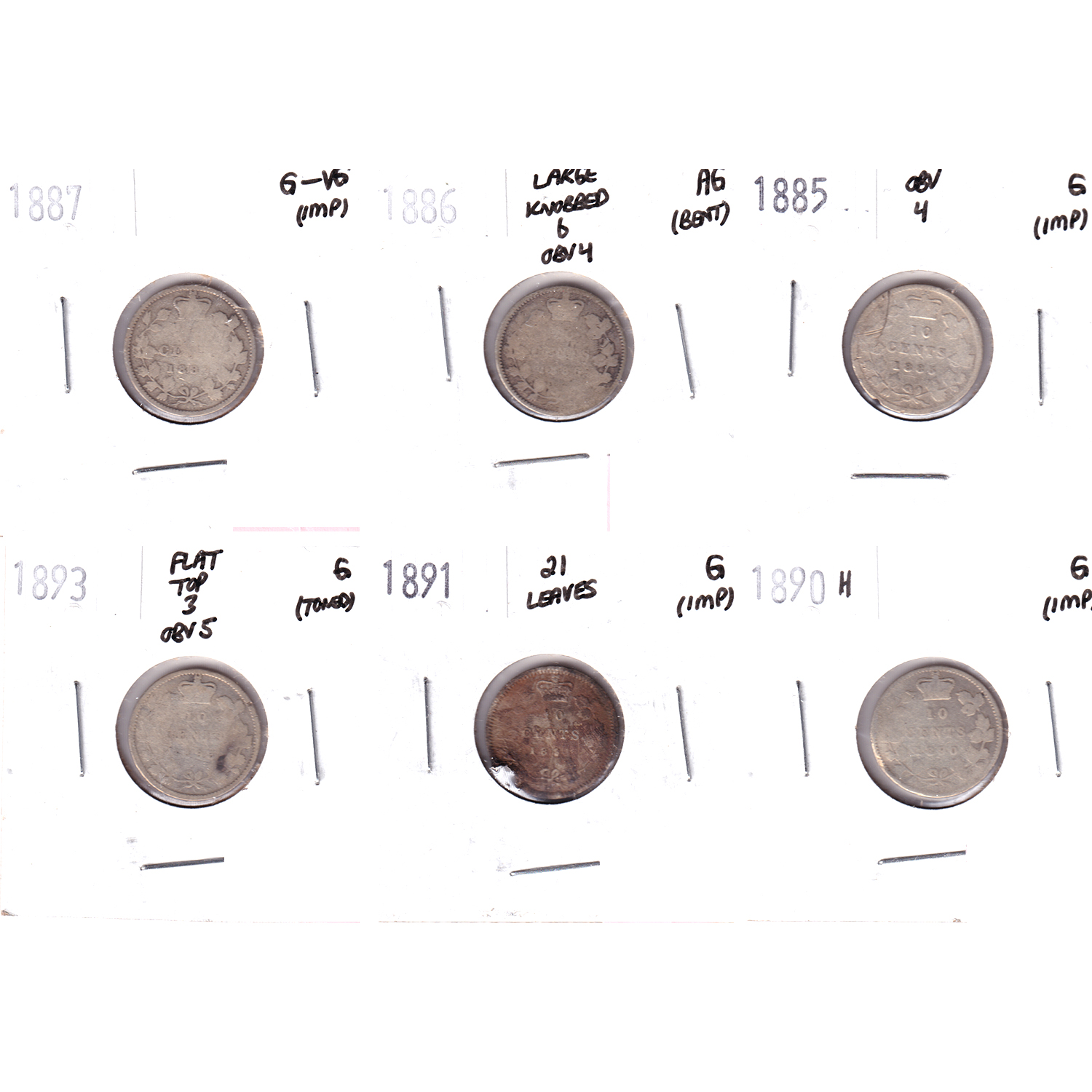 INCLUDES: 1885 obverse 4 G (impaired), 1886 large knobbed 6; obverse 4 AG (bent), 1893 flat top 3; obverse 5 G (toned), & more! Sold as is; please see images for details. 6pcs.