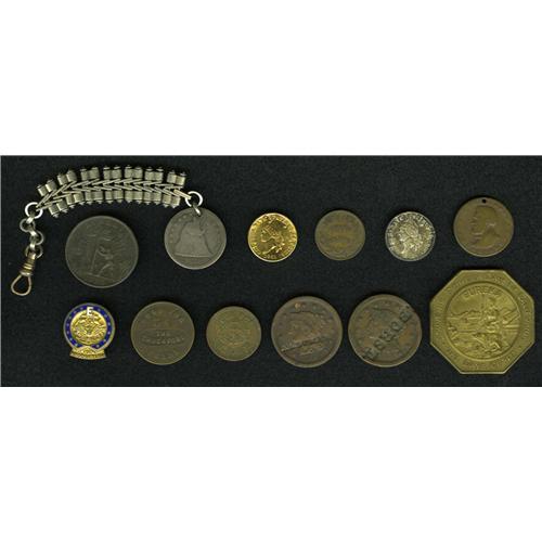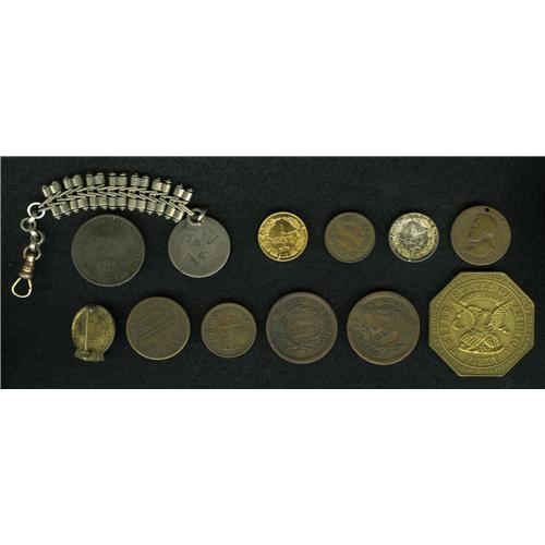 <B>Bulk Lot of 12 Miscellaneous Coins and Tokens, Uncertified.</B></I> This lot includes: a watch fob made with an 1858 quarter; multiple defaced-die Confederate cent restrikes; tradesman's tokens; two counterstamped large cents; and others.