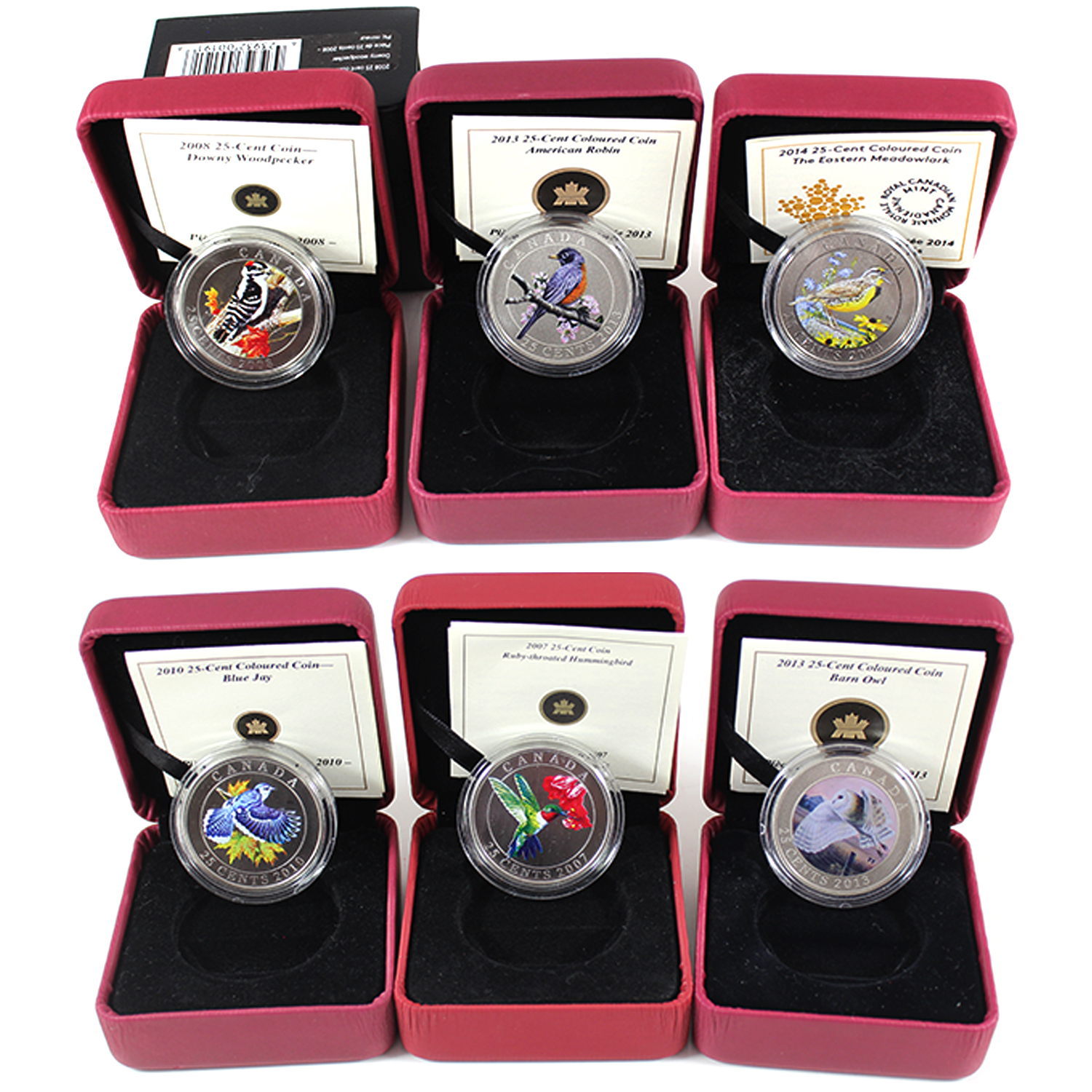 INCLUDES: The 2008 Downy Woodpecker (damaged sleeve), 2010 Blue Jay, 2013 Barn Owl, & more! Some scuffing to capsules. Sold as is; please see images for details. 6pcs.