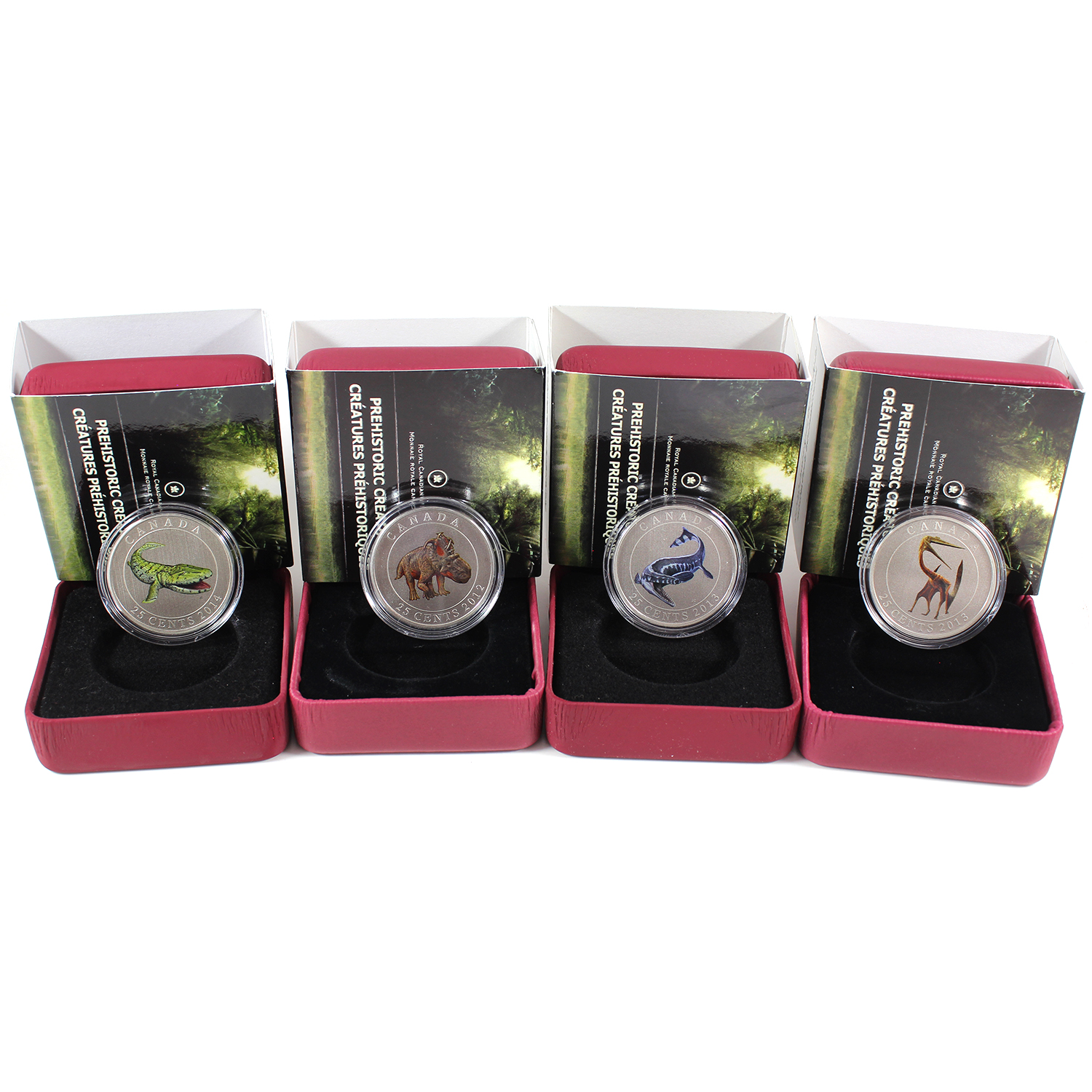 INCLUDES: 2012 Pachyrhinosaurus Lakustai, 2013 Tylosaurus Pembinensis, 2013 Quetzalcoatlus, & 2014 Tiktaalik - glow in the dark. Coins are lightly toned. 4pcs.