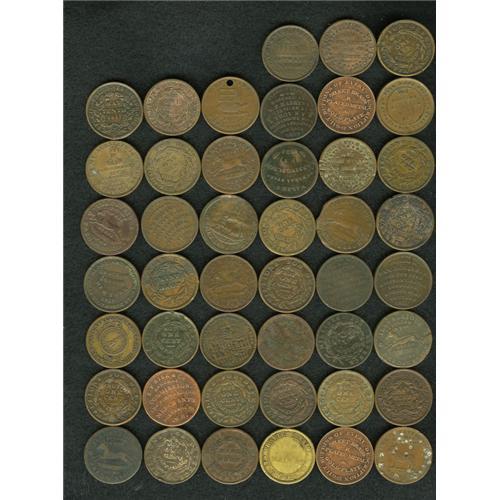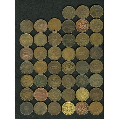 <B>Bulk Lot of 45 Miscellaneous Hard Times Tokens, Uncertified.</B></I> This lot includes a variety of motifs and compositions. An excellent lot for dealers or those who want an inexpensive start in the field.