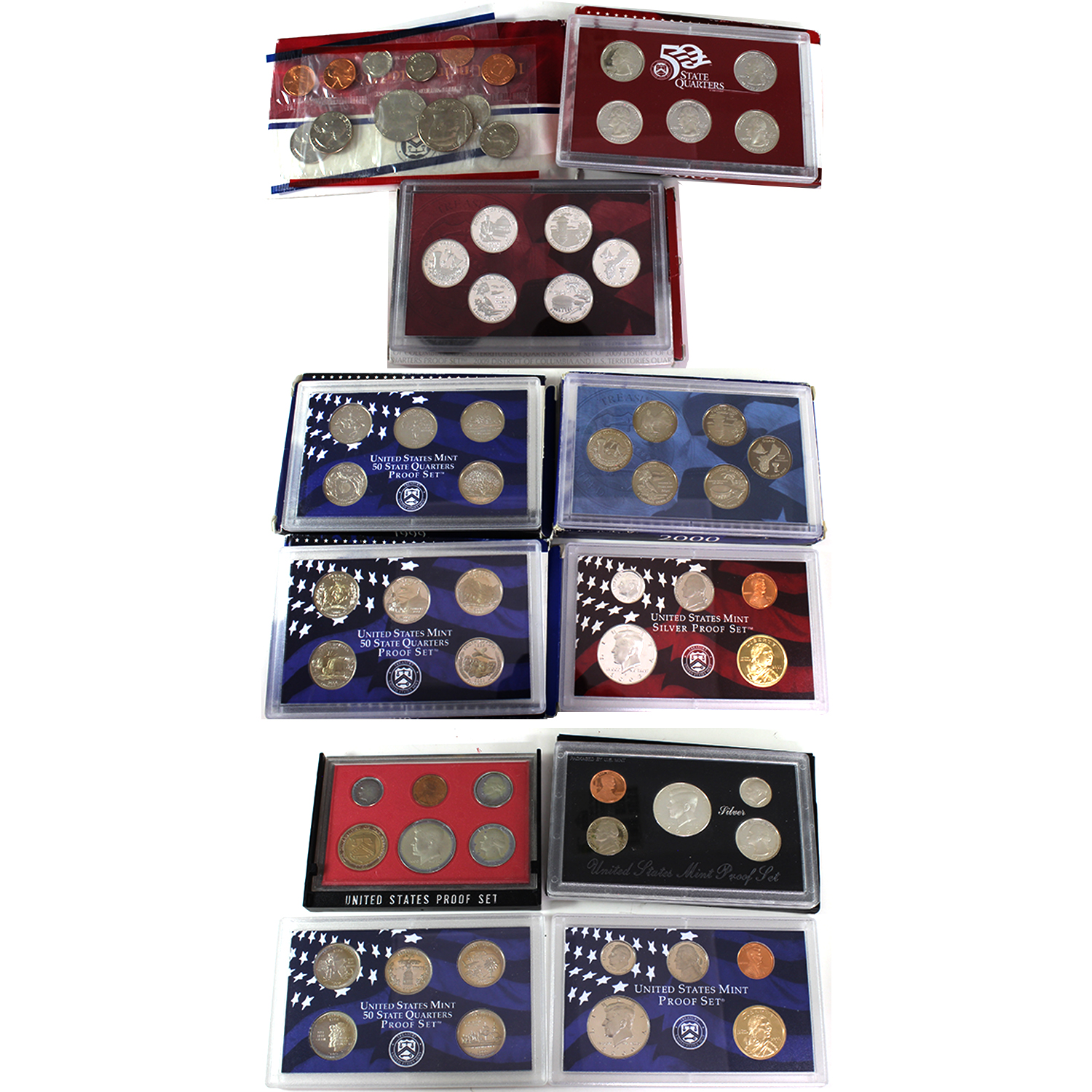 INCLUDES: 1987 Uncirculated Coin Set, 1992 United States Mint Silver Proof Set, 2009 District of Columbia & U.S. Territories Quarters Silver Proof Set, & more! Sold as is; please see images for details. 9pcs.