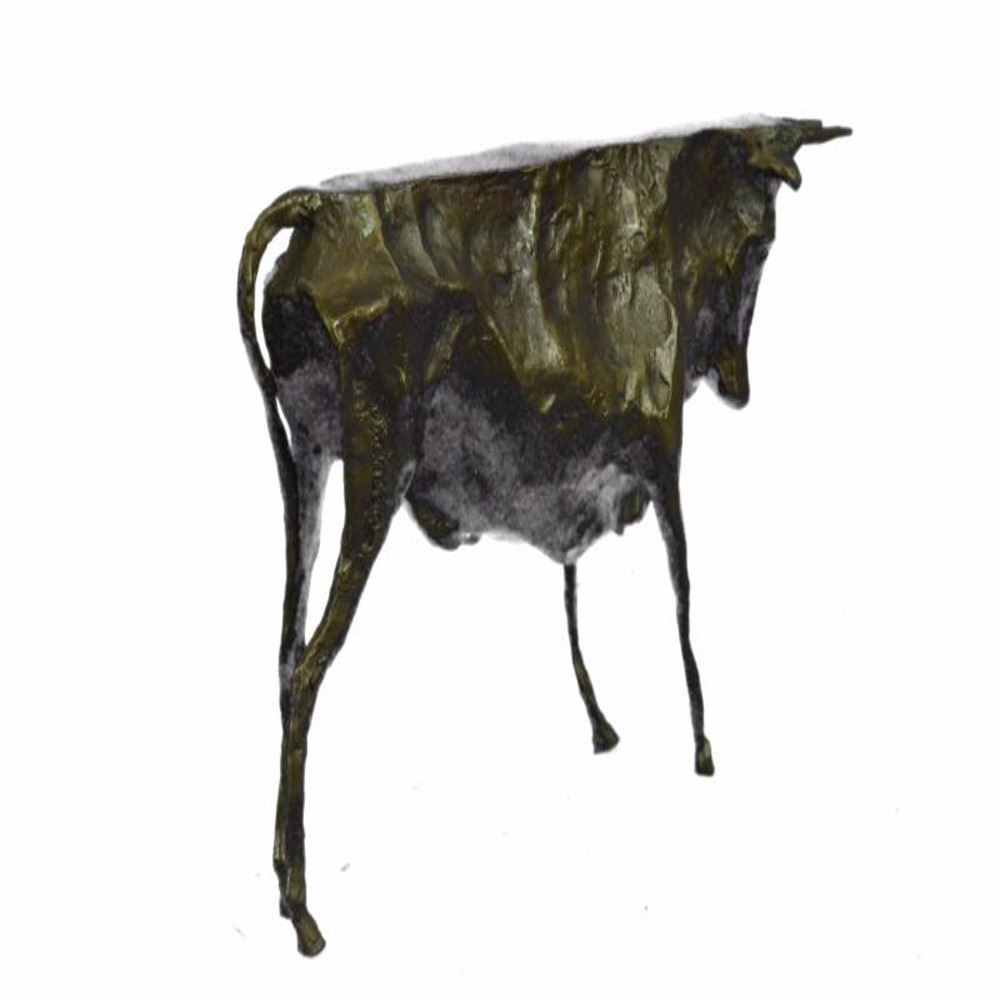This is a small animal Bronze Art slim abstract bull. This Sculpture is an absolutely great artwork with a motive full of strength and fighting spirit which the bull can always use to win against the enemy. The Bull is also a well-known symbol for increasing stock levels. The Sculpture is an impressive Bronze and fantastic art object. The Bronze cast is made of the finest quality Bronze. In comparison with the original, this Bronze is so filigreeing as possible. The amazing Sculpture was made and used to display in an exhibition. Dimensions: Height 6 X Width 10 inches. Weight: 3 LBS.