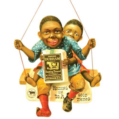 Extremely Rare Bull Durham Smoking Tobacco Sign, die cut, two sided string hanger. Depicts two black children on a swing. Repaired tear on head of boy and some tape damage to back otherwise very good condition. Originally from the George Haney Collection. 9 X 11 inches image only.