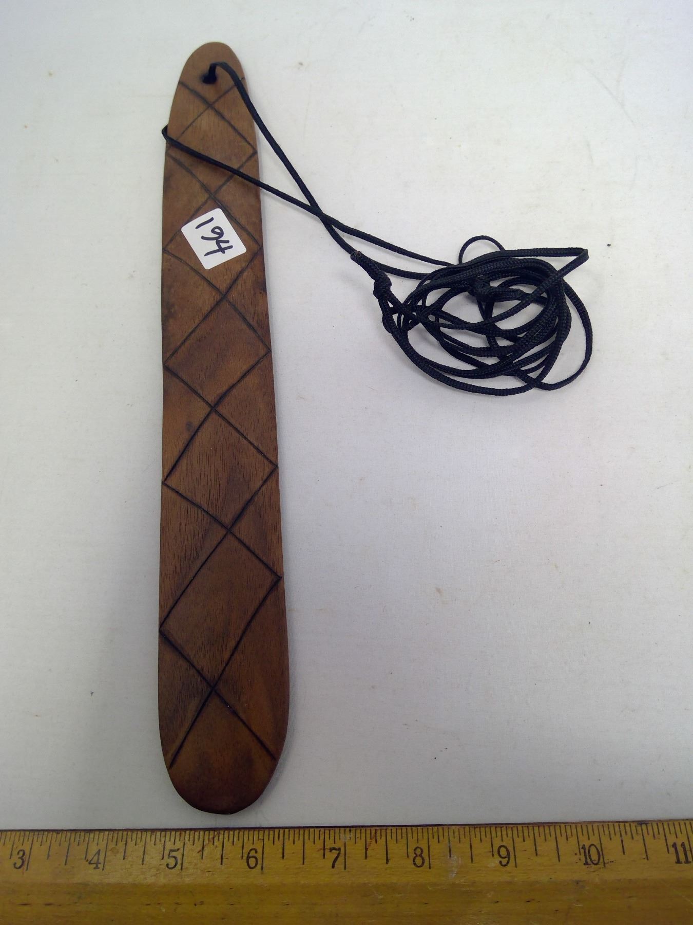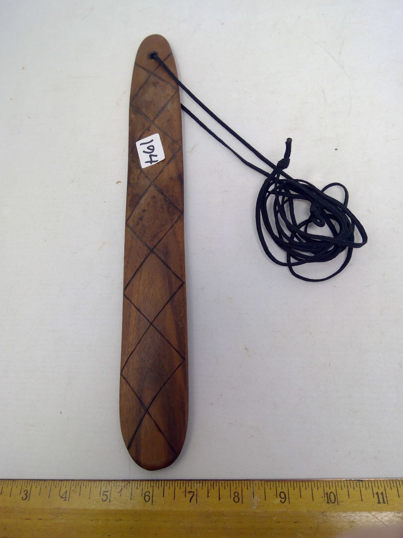 194 Woomera Australian Indigenous “Bullroarer”. When swung, it makes a roaring sound that communicated and attracts game. Length: 13”