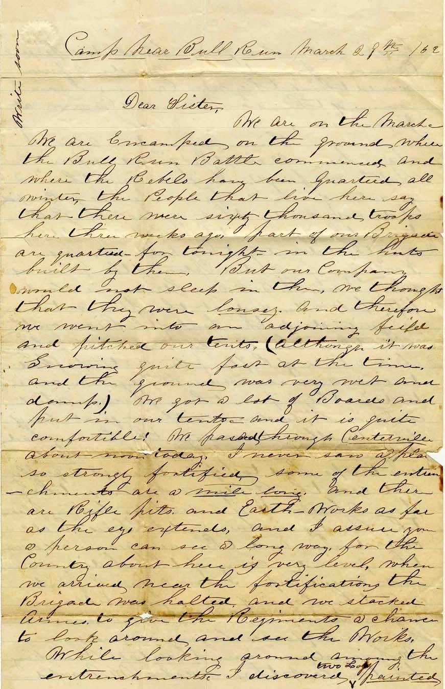 Letter by Sergeant William R. Carr of the 12th Massachusetts Infantry, Co. I, who would later die at Gettysburg. Writing to his sister on 29 March 1862 at ''Camp Near Bull Run,'' lengthy letter reads in part, ''We are encamped on the ground where the Bull Run Battle commenced and where the Rebels have been quartered all winter, the people that live here say that there were sixty thousand troops here three weeks ago…I have been all over the ground where the battle was fought. It is not more than a quarter of a mile from where we are camped. I do not wonder that we lost the battle, to see the posision that the Rebels held and the advantage they had over us…The Bull Run Stream is about fifty feet wide and at the present time is quite deep. The banks of the River on the side that the Rebels were on is nothing but a line of rifle pitts, our troops had to cross a small wooden bridge in order to drive them from their posision, which could not have been done without great loss of life. Another advantage that the enemy had they were covered by the woods, while our troops had to file through a gully and cross the bridge, not more than four abreast. It is a desolate looking place. The bridge is burnt, the trees are all cut down, and there are graves all over the ground some of the bodies are not covered up. I saw a pair of pants with the bones of some poor fellow in them. I should think that I saw a hundred horses laying around…'' Signed ''From your Brother William'' with original mailing envelope. Identified from a larger collection of William Carr letters, as well as from a reference within letter to another soldier in the company who hails from same town as Carr. Near fine condition.