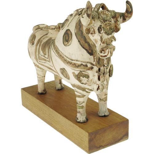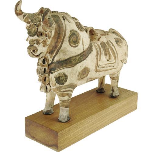<B>Pre Columbian-Style Bull Statue Featured in Sanford Roth Photos of James Dean.</B></I> This medium-sized, ornate 14" x 18" pre-Columbian painted pottery model of a bull, visible in the foreground of a series of photos of James Dean (and his cat, Marcus) by Sanford Roth. The famed photographer met Dean during the filming of <I>Giant,</B></I> and served as the actor's photography tutor and also shot a number of great photos of the actor during the final months -- and final hours -- of his life. The bull was made in Pucara, Peru, is approximately 70 years old, and in Excellent condition, on a wood pedestal measuring 14" x 3" x 6". Included with the lot is a print of the photo.<BR><BR><b>Shipping:</b> Other (TBD) (<a target="_blank" href="http://www.heritageauctions.com/common/shipping.php">view shipping information</a>)