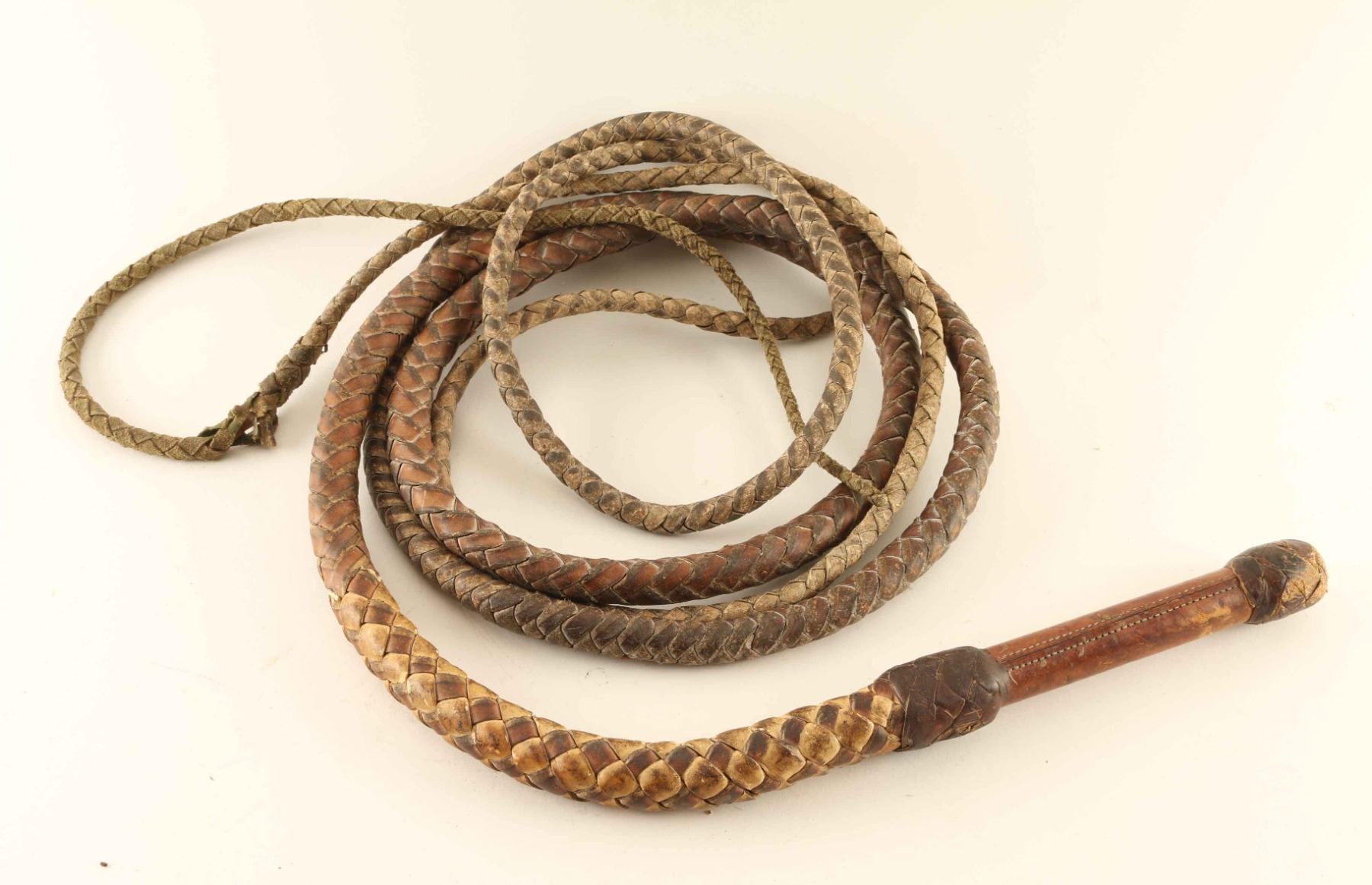 Braided brown leather and show use and wear, has crack in handle. Great decorator.