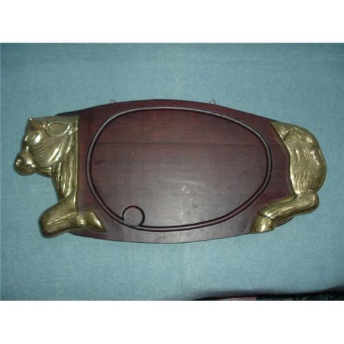 Teakwood platter for carving & serving steaks & roasts. Ideal for BBQ or buffet. Decorative brass bull's head & hind quarters. Has a blood gutter & non-toxic finish. Some small defect spots. Overall 25" x 11.5"