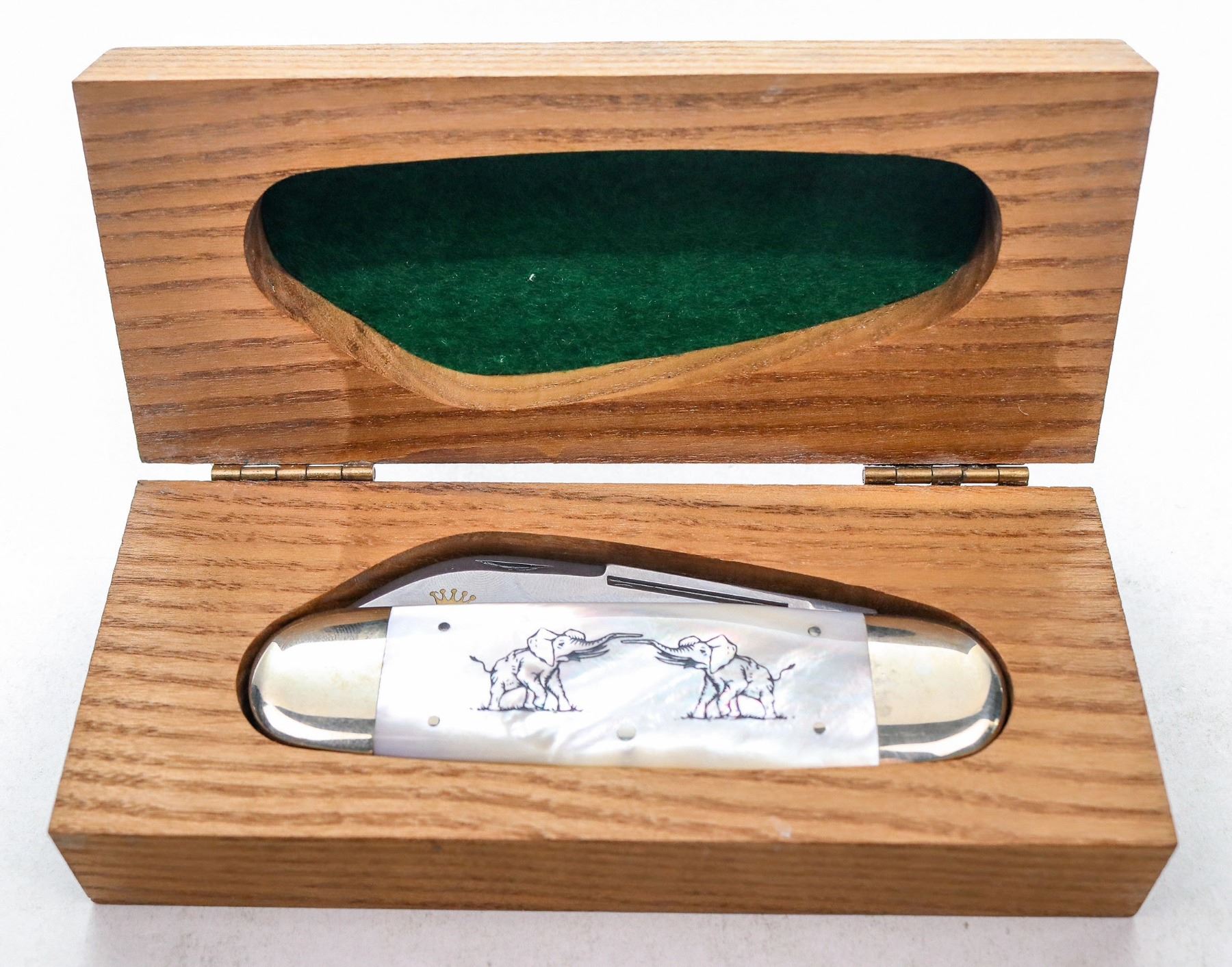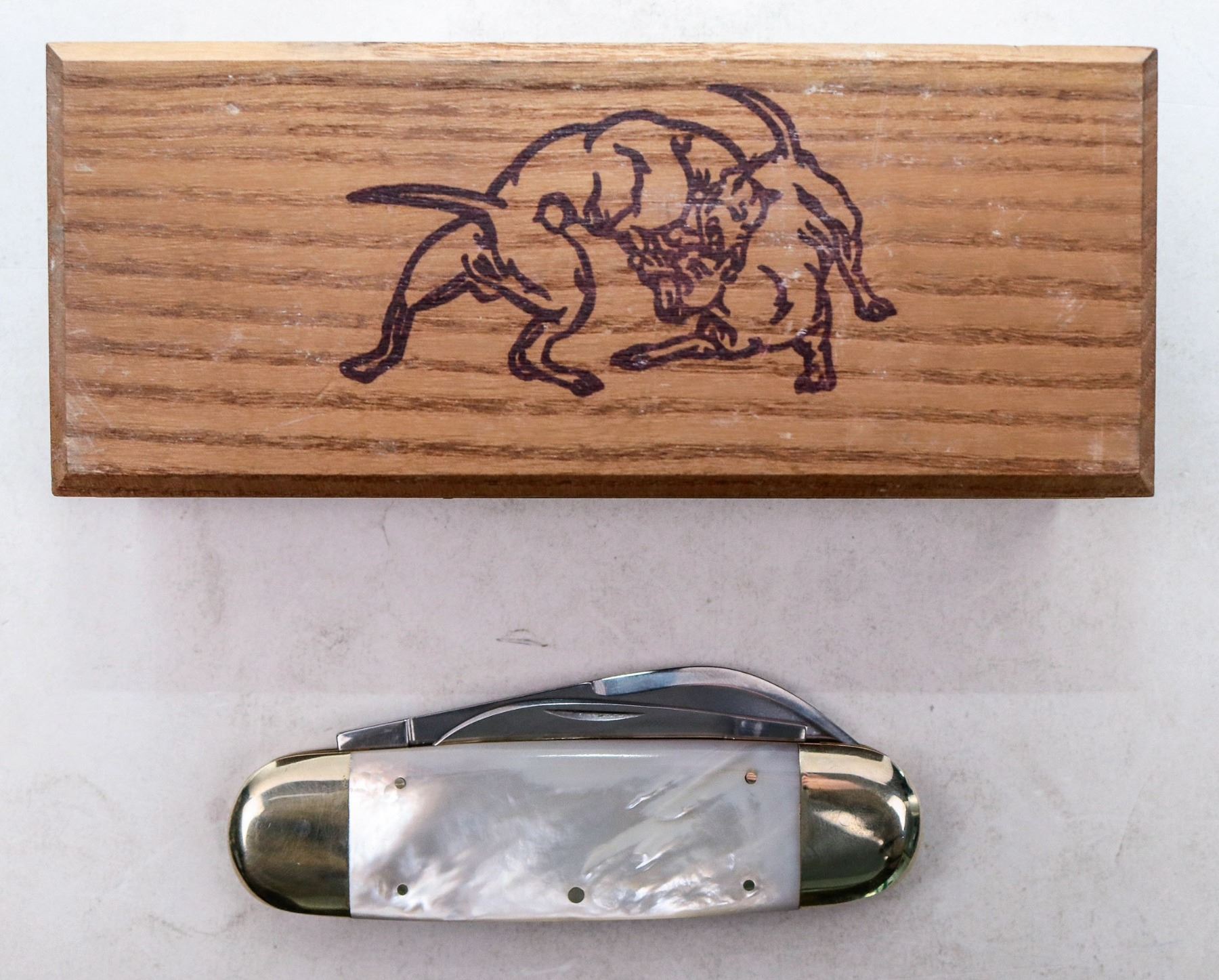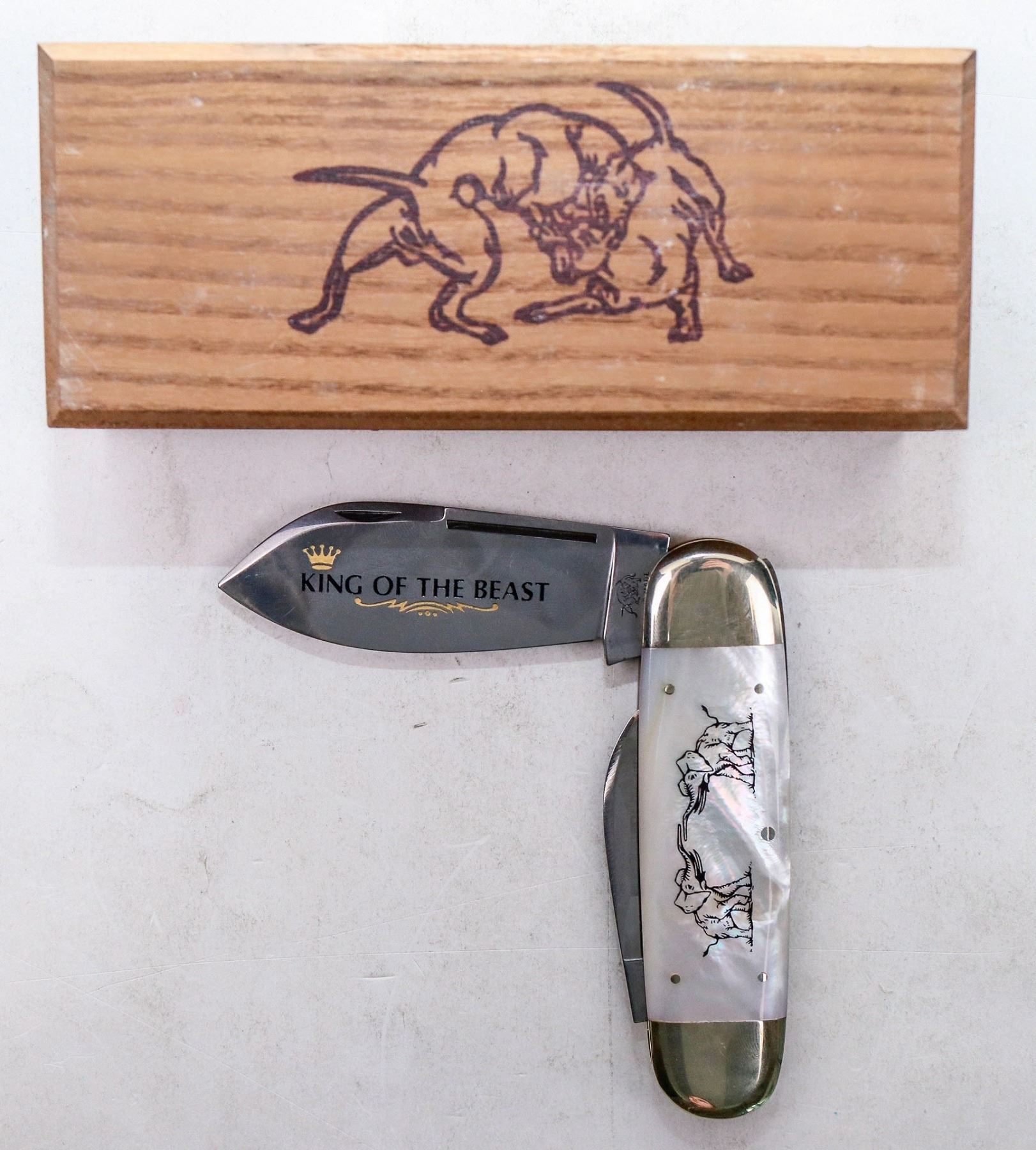 This is a Bulldog brand "King of The Beast" folding knife made in 1995. It has elephant toe and sunfish blades. The scales are real pearl held with five pins. Two fighting elephants are engraved into the pearl scales on one side. The reverse side without the engraved elephants has a dimple in the middle pin to remind you that this is real pearl; and it reflects light beautifully. 4.25 in. closed. New in a presentation wood box with green felt liner. Blades have the factory edge. Please see photo for details.