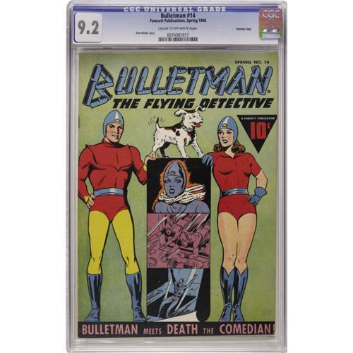 <B>Bulletman #14 Crowley Copy pedigree (Fawcett, 1946) CGC NM- 9.2 Cream to off-white pages.</B></I> Death the Comedian has everyone dying of laughter in this pedigree issue with an Otto Binder story. Overstreet 2006 NM- 9.2 value = $840. CGC census 10/06: 1 in 9.2, none higher.<BR><BR><b>Shipping:</b> Slabbed Comic (<a target="_blank" href="http://www.heritageauctions.com/common/shipping.php">view shipping information</a>)