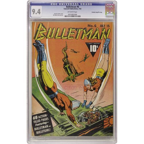 <B>Bulletman #6 Crowley Copy/File Copy (Fawcett, 1942) CGC NM 9.4 Off-white pages.</B></I> A Charles Sultan cover and Bill Ward art add to the collectibility of this beautiful Crowley File Copy. There is a Checking Copy stamp on the cover. Overstreet 2006 NM- 9.2 value = $1,100. CGC census 10/06: 1 in 9.4, none higher.<BR><BR><b>Shipping:</b> Slabbed Comic (<a target="_blank" href="http://www.heritageauctions.com/common/shipping.php">view shipping information</a>)