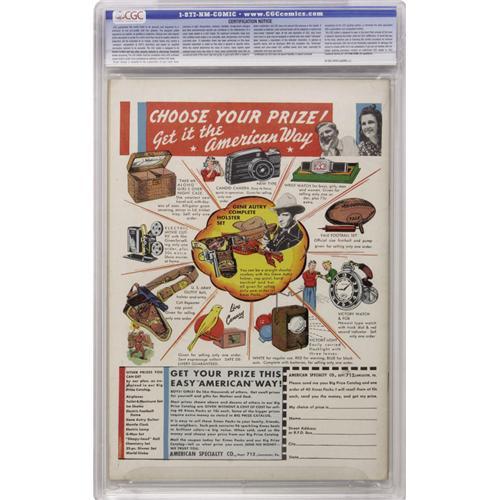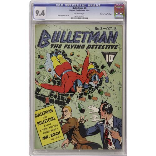 <B>Bulletman #8 Crowley Copy/File Copy (Fawcett, 1942) CGC NM 9.4 Off-white pages.</B></I> A smashing cover fronts this pedigree book which features Dave Berg art. Overstreet 2006 NM- 9.2 value = $1,100. CGC census 10/06: 1 in 9.4, 1 higher.<BR><BR><b>Shipping:</b> Slabbed Comic (<a target="_blank" href="http://www.heritageauctions.com/common/shipping.php">view shipping information</a>)