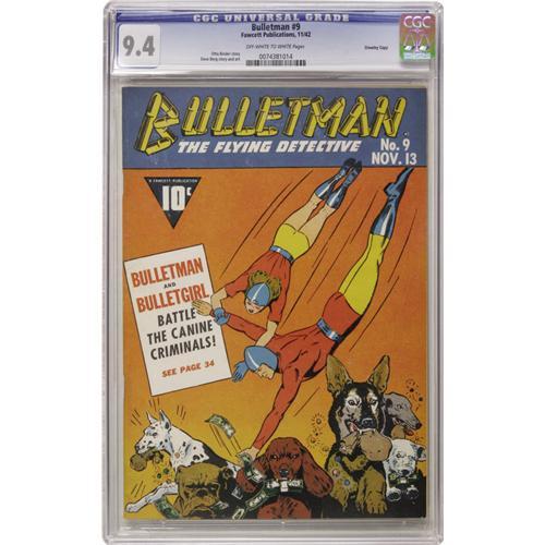<B>Bulletman #9 Crowley Copy pedigree (Fawcett, 1942) CGC NM 9.4 Off-white to white pages.</B></I> Bulletman and Bulletgirl are in dogged pursuit of the Canine Criminals in this Crowley Copy. Art is provided by Dave Berg. Overstreet 2006 NM- 9.2 value = $1,100. CGC census 10/06: 2 in 9.4, none higher.<BR><BR><b>Shipping:</b> Slabbed Comic (<a target="_blank" href="http://www.heritageauctions.com/common/shipping.php">view shipping information</a>)