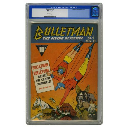 <B>Bulletman #9 (Fawcett, 1942) CGC FN+ 6.5 Off-white pages.</B></I> Artists include Dave Berg. Overstreet 2006 FN 6.0 value = $243; VF 8.0 value = $506. CGC census 3/06: 1 in 6.5, 6 higher.