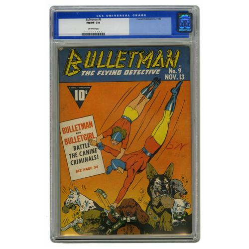<B>Bulletman #9 (Fawcett, 1942) CGC FN/VF 7.0 Off-white pages.</B></I> "Ghost Stories" backup feature with Dave Berg art. Overstreet 2006 FN 6.0 value = $243; VF 8.0 value = $506. CGC census 3/06: 1 in 7.0, 5 higher.
