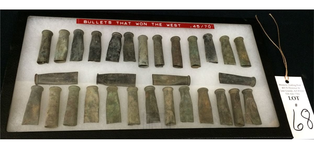 This display is loaded with 30 old .45/70 shell casings which have been fired (many have U.S. arsenal and date marks visible, showing 1870s - 1890s)! The .45/70 is what U.S. Soldiers carried during the Indian War period of the Southwest. They came out of the old Frontier Relics Museum (Orville Mickens estate). Mr. Mickens found most of the items in his museum while tromping around historical areas in Arizona and New Mexico. Please look at pics to see what all you will get. Shipping: There will be a $7 handling / packaging fee for shipping this lot. The actual cost of postage will be added on top of that.