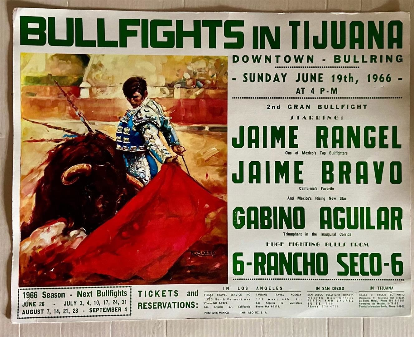 An original Poster by R Basso, from a 1966 Gran Bullfight in Tijuana Mexico, printed on cardboard 17.75x22.75"