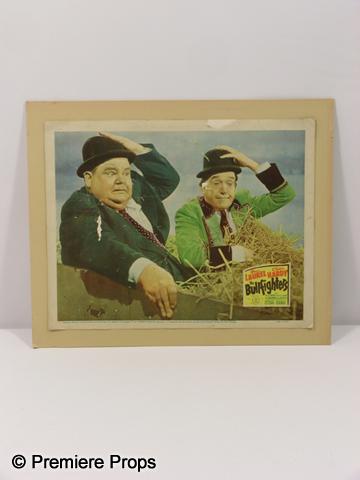 The Bullfighters (1945) color movie photo with Stan Laurel "Don Sebastian" and Oliver Hardy "Ollie" in a car holding their top hats. (approx. 16" x 13")