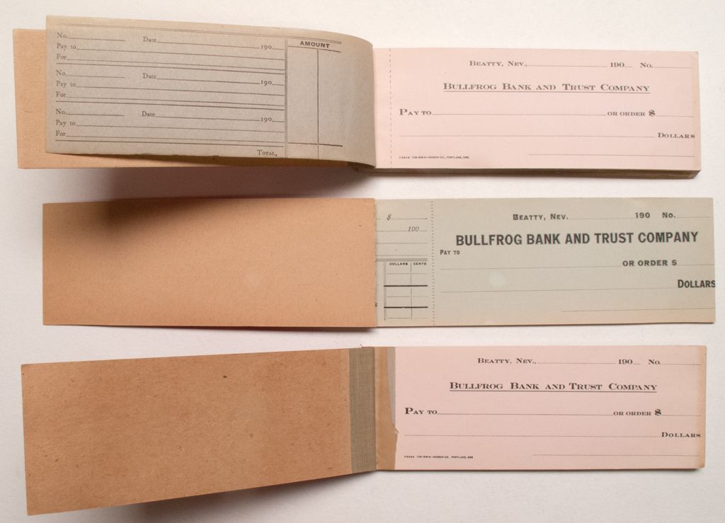 Three checkbooks. Light blue-green paper in light red board booklets of 10 checks and two tan checks in bright red board booklets (25 and 50 checks). Unused, in very good condition .Two have red and the other blue linen bindingCity: BeattyCounty: NyeState: NV