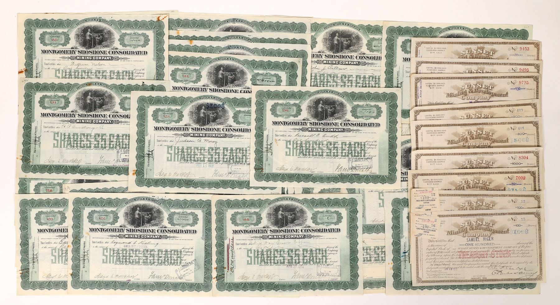19 Sunset Mining stocks, c. 1913-29. 40 Montgomery Shoshone Cons, c. 1908-14, 38 have small paper clip rust stains. Please inspect.