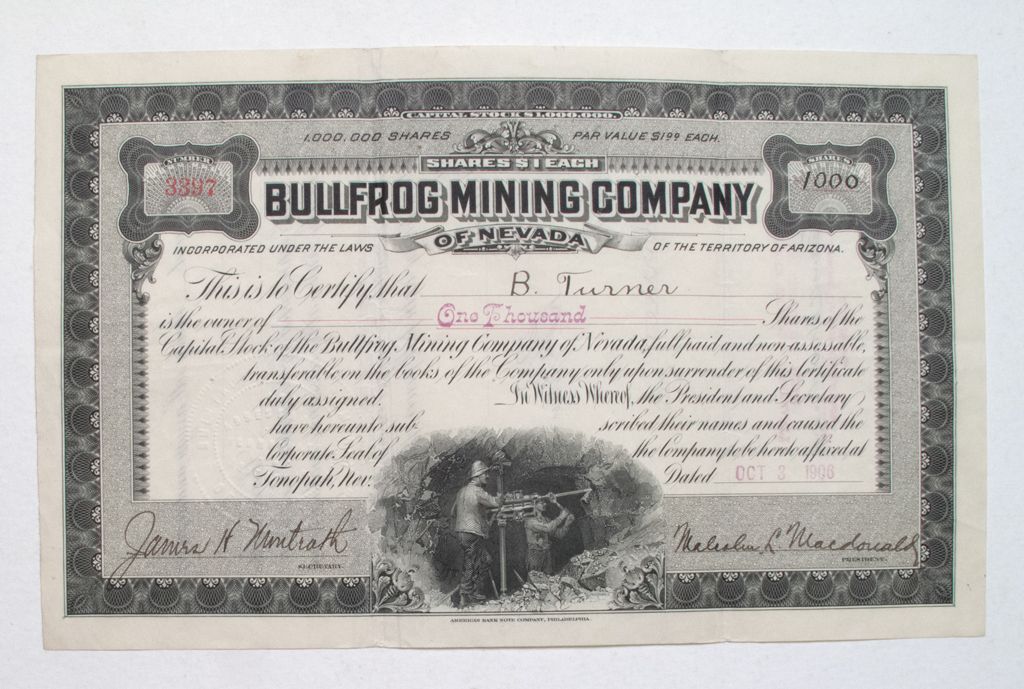 Incorporated in the Territory of Arizona, 1904; No. 3397 issued October 3, 1906 to B Turner for 1000 shares; signed by Malcolm L. Macdonald as President and James H. Nuntrath (?), Secretary; printed by the American Bank Note Company, Philadelphia; U/C; black ink on crème paper. One vignette at bottom center shows two men using a power drill underground. This mine was located south of Ladd Mountain and on Ladd Mountain [Ref: Holabird, Filer III, 47]. Malcolm L. Macdonald was instrumental in the marketing of mines in the Bullfrog district.City: BullfrogCounty: EsmeraldaState: NV
