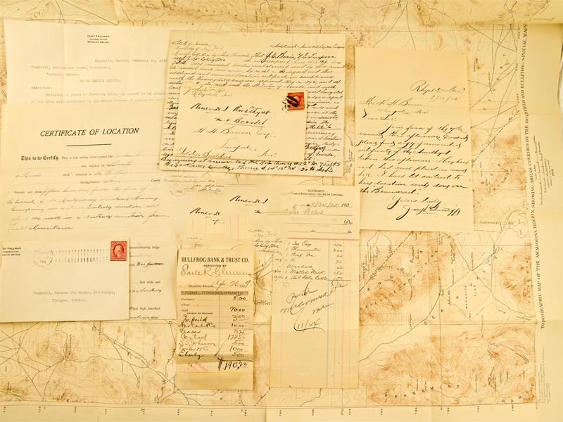 Lot of about 24 pieces. These include: 1910 Letter and cover to Campbell, Metson and Brown, Attorneys in Tonopah, regarding the Guisti estate, from the office of attorney Clay Tallman in Rhyolite; Letter from John Doser, Real Estate, Mines and Stock Broker in Beatty, Nev., dated 1908, regarding the Guisti estate; Certificate of Location for the Roadmaker Fraction claim, dated March 1905, which was situated about 1500 feet from the tunnel of the Montgomery Shoshone Mining Company; 1906 Topographic Map of the Armargosa Region, showing areas covered by the Goldfield and Bullfrog special maps, 23 x 19;” Booklet of 10 colored photographic prints of Historic Highlights of Nevada, 2.75 x 4;” Deposit receipt from the Bullfrog Bank & Trust Co. of Earle R. Clemmens, 1909; Amended location certificate for the Amethyst Lode by J.E. Bevis, G.E. Turpen and J.C. Clayton, dated 1905; Bill from the McCormick Drug Co. in Rhyolite to Mr. Geo. Welsh, 1905; 1905 Letter from Joseph Sutcliff to Mr. H.H. Brown in Tonopah regarding the amended certificate of the Amethyst; Original clippings from an unknown publication showing the Bottle House and Bullfrog mining scenes; Checkbook of blank checks from the Bullfrog Bank and Trust Company in Beatty; 2-page Handwritten invoice from the Rhyolite Herald by G. Keene, 1909; Forward Mining Development Co. prospectus and a typed annual report to the stockholders for 1905; Rhyolite, Death Valley’s Ghost City of Golden Dreams, 1953 pamphlet published by the Calico Press,32 pgs.; Weekly Market Review on Southern Nevada Securities, dated May 1906, and Market Review publication, Vol. II, No. 9, dated May 1, 1906; 3 Mining leases, 2 dated 1913 between Frank Staplin of Goldfield and F.E. Schultz and F.E. O’Neal for property south of Gold Crater in an unknown mining district, and the third dated 1917 between James Foreman of Oakland, CA and F.E. Schultz for property in the Gold Crater Mining District; 1919 Voucher for the Reorganized Pioneer Mines Company to J.K. Turner of Goldfield; Patrick, Elliott & Camp, Inc. brochure from Goldfield; Report of the Tonopah Goldfield Trust Co., at Gold Center, Nev., dated January 31, 1908; Deed dated March 1913 between Walter S. Norris and Edw. S. Van Dyck of Goldfield and the Sunset Mining & Development Co.; Tonopah and Tidewater Railroad Co., Ltd. Letterhead with Death Valley, California address; Publication titled Life in the Ghost City of Rhyolite, Nevada, by Betsy Ritter, published by the Terra Bella News in Terra Bella, California, printed by the Sagebrush Press, 1982, 20+/- pages with photos.