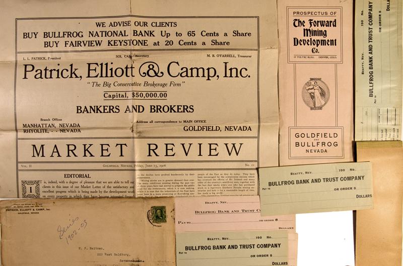 Lot of seven pieces related to Bullfrog. Included are: Market Review newspaper, dated July 15, 1906 in Goldfield (Vol. II, No. 11); a cover from the firm of Patrick, Elliott & Camp, Inc. in Goldfield, with a receiving postmark of Jun 22, 1906; 3 blank checks from the Bullfrog Bank and Trust Company in Beatty; Forward Mining Development Co. prospectus; a checkbook with about a dozen blank checks, from the Bullfrog Bank and Trust Company.