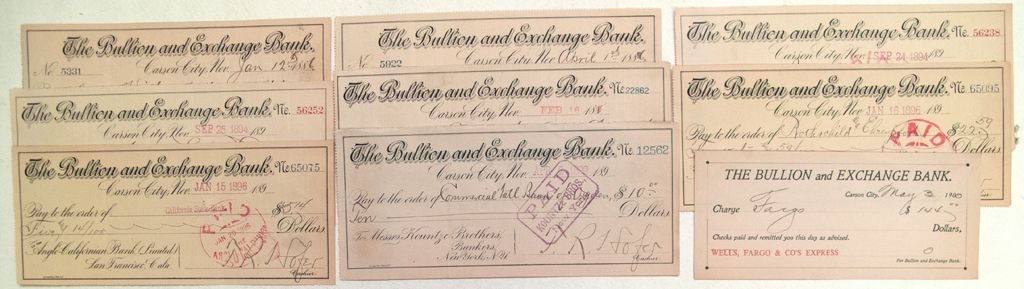9 checks of The Bullion and Exchange Bank. 8 signed by T R Hofer. 1 blank.