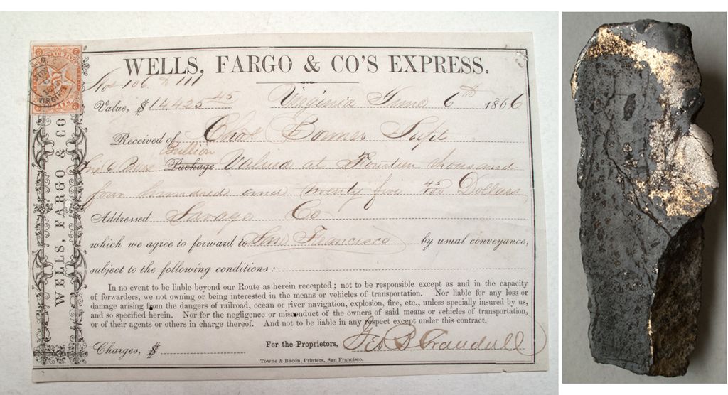 Great combination to fire the imagination of life in 1866. The Wells Fargo & Co.'s Express receipt is to Charles Bonner, Superintendent (Savage Mine) for bullion valued at $14,424.45. Signed by George Crandall. In a frame, but glass is cracked and broken. One nice ore specimen to remind us of the great Comstock wealth. Virginia City Storey County State:NV