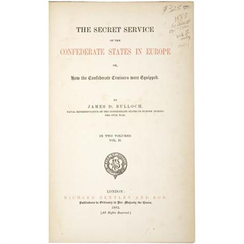 <B>James D. Bulloch. </B></I><B><I>The Secret Service of the Confederate States or How the Confederate Cruisers Were Equipped</B></I></B></I><B>, Volume II. </B></I>London: Richard Bentley and Son, 1883.<BR> <BR>First English edition. Octavo. 438 pages.<BR><BR>Original blue cloth with decoration stamped in blind on the boards and titles in gilt on the spine. Spine toned. Soiling and scuffing to boards. Head and foot of the spine frayed. Text block slightly skewed. Hinges starting to crack. Contents slightly toned but sound. Good condition.<BR><BR><BR><b>Shipping:</b> Books & Catalogs (<a target="_blank" href="http://www.heritageauctions.com/common/shipping.php">view shipping information</a>)