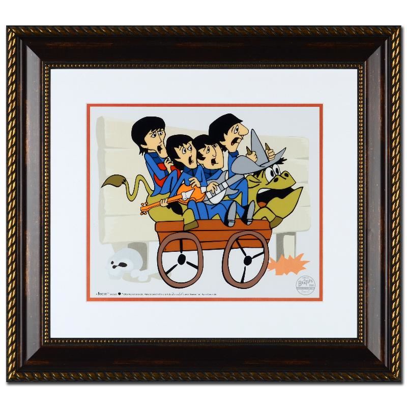 This must-have sericel re-creates a wacky scene from "The Beatles" Saturday morning cartoon series! "The Beatles: Bullride" is a limited edition sericel and bears the official DenniLu Company stamp! This piece has been framed and is ready to hang. Includes Certificate of Authenticity! Measures approx. 20.5" x 18.5" (framed); 12" x 10" (cel and background).