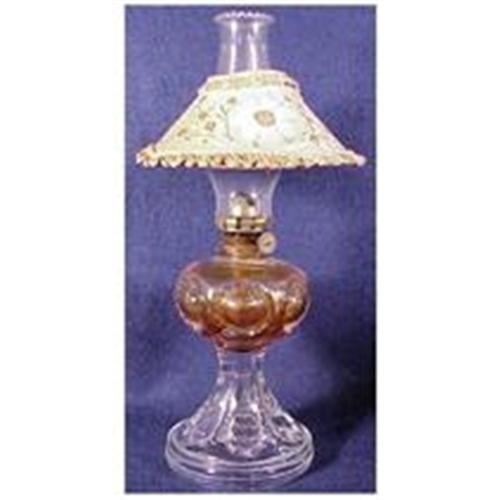 This miniature " bullseye with diamond point oil lamp is 5 1/2" from base to collar. The chimney adds another 4 3/4" to the height. There is a copper heat protector under the paper shade. I do believe this lamp is 100% original.