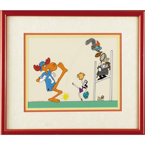 <B>Bullwinkle, Rocky, Boris and Natasha "Football" Limited Edition Hand Painted Cel Original Art (Jay Ward Productions, 1988).</B></I> Wossamotta University's star football player, Bullwinkle, tries to score, with a little help from Rocky, but gets a little interference by Boris, in this hand painted cel. The work is matted and framed, with an image area of 12" x 9.5". In Very Good condition. <BR><BR><B>Important notice:</B> Heritage usually auctions material at the rate of 200-250 lots per hour. On some occasions eBay Live bid software or the Internet may not be able to keep up with the pace of the auction. We recommend placing a realistic absentee bid now as insurance to avoid disappointment. Occasionally the auctioneer may eliminate or reject an eBay Live bid, and the auctioneer may also reopen a lot after the close of the eBay live bidding (usually because we missed an audience bid), and may reject your bid even if it shows you as the winning bidder. By bidding via eBay Live, you agree that Heritage may award the lot to another bidder at its sole discretion under the circumstances described above or any other reasonable circumstances. Since eBay bids are not shown to us until we open the lot on the floor, we treat those bids just like floor bids. In most cases the floor responds before the eBay bid is presented to us, due to Internet lag time, so for consistency we have made it a policy that floor bids are always considered first over tie eBay live bids. Also please note that all Heritage lots purchased through eBay Live carry a 22.5% Buyer's Premium. Please make sure you read the Terms and Conditions before you bid. This lot is being auctioned in conjunction with a live floor auction by Heritage Auction Galleries. All final auction and invoice information will be supplied by Heritage Auction Galleries, and all other information should be considered preliminary. Lot:41001 <BR><BR><B>Winning Notification and Billing:</B> After the FINAL session in this auction is complete, Heritage will send e-mail and snail mail invoices. This process normally takes several days. All final auction and invoice information will be supplied by Heritage Auction Galleries, and all other information should be considered preliminary. <BR><BR>This auction will be conducted on a live auction floor and over the Internet through eBay Live. If you choose to place an absentee bid, please take a moment to <font color='#0000ff'><u><a href='http://pages.ebay.com/liveauctions/help/before/laabsentee.html'>learn how eBay Live absentee bidding works</a></u></font><font color='#000000'>