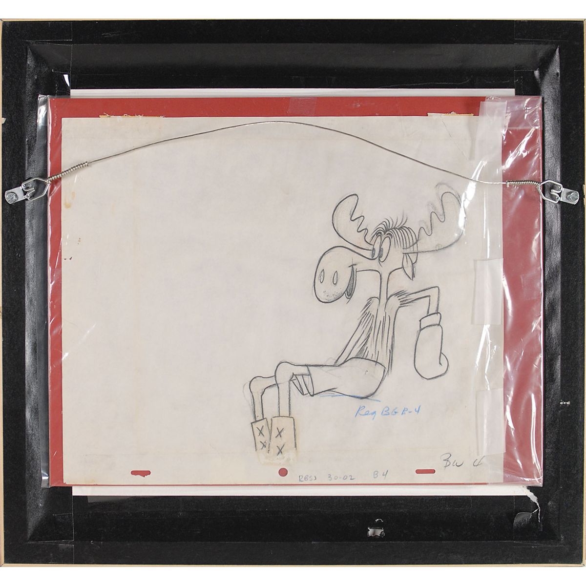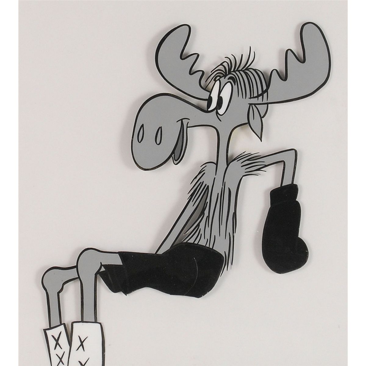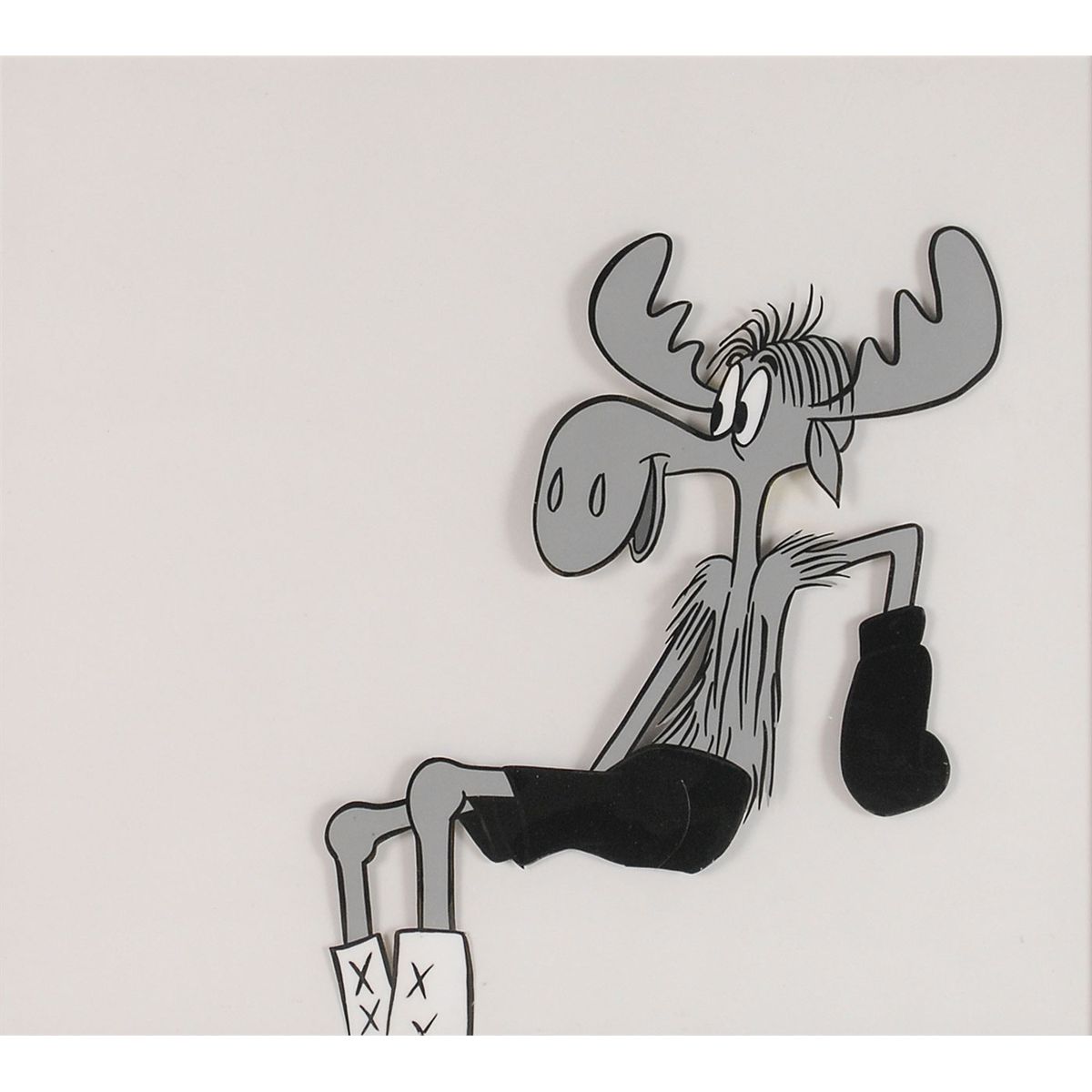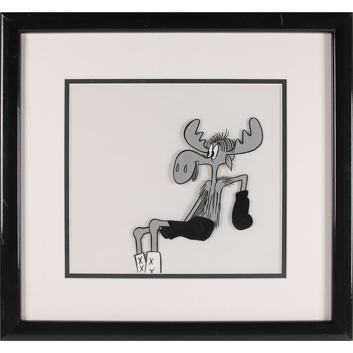 (Jay Ward Productions, 1959) Original production cel and matching drawing featuring Bullwinkle from a TV commercial, showing him as a boxer. Cel image measures 6.25 x 7.25, with a mat opening of 10 x 9. This piece is also framed to an overall size of 16.75 x 15.75. The matched drawing, unframed, is accomplished in graphite on untrimmed 12.5 x 10.5 animation paper. In fine condition.