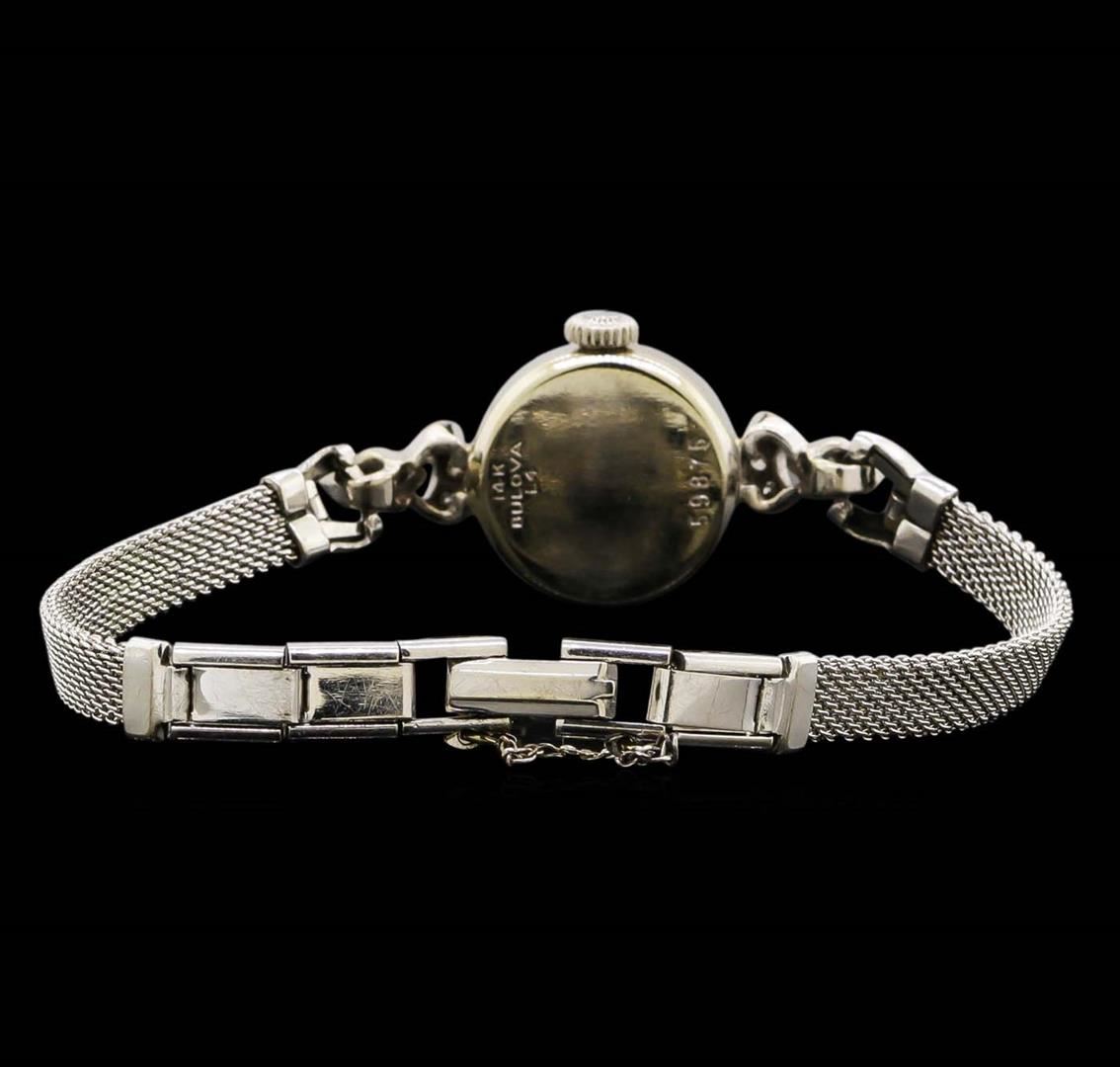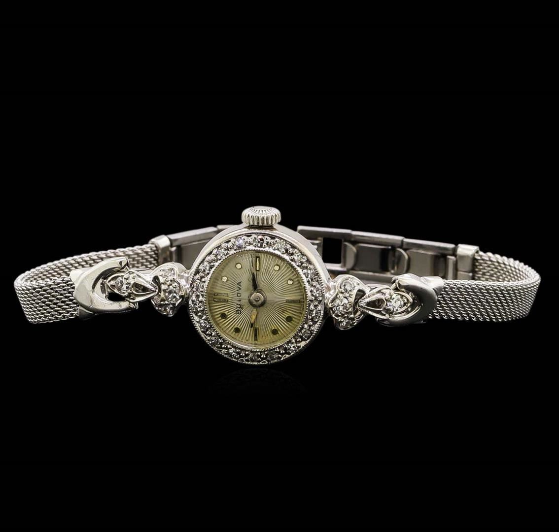 One ladies, vintage Bulova diamond wristwatch electronically tested, 14KT white gold Case: 15mm diameter, Scalloped Crown: dial & movement set, Bezel: diamond, Crystal: domed acrylic. Case No. 59875.Swiss Movement: seventeen jewel unadjusted mechanical, Dial: cream color, with baton pointed type hands, & indices, 10KT white gold Bracelet: mesh link, Condition: G-4 Average. Bright polish finish, Five inch length. Over locking clasp. Containing: Twenty Six bright cut & bead set single cut diamonds, approximate. Total Weight of 26 Stones = 0.22ct. Graded in the setting. Clarity: SI-1 to I-1. Color: G - I. Total Weight of Diamonds 0.22ct. Total Weight of Watch 9.80 grams. AIG Appraised.