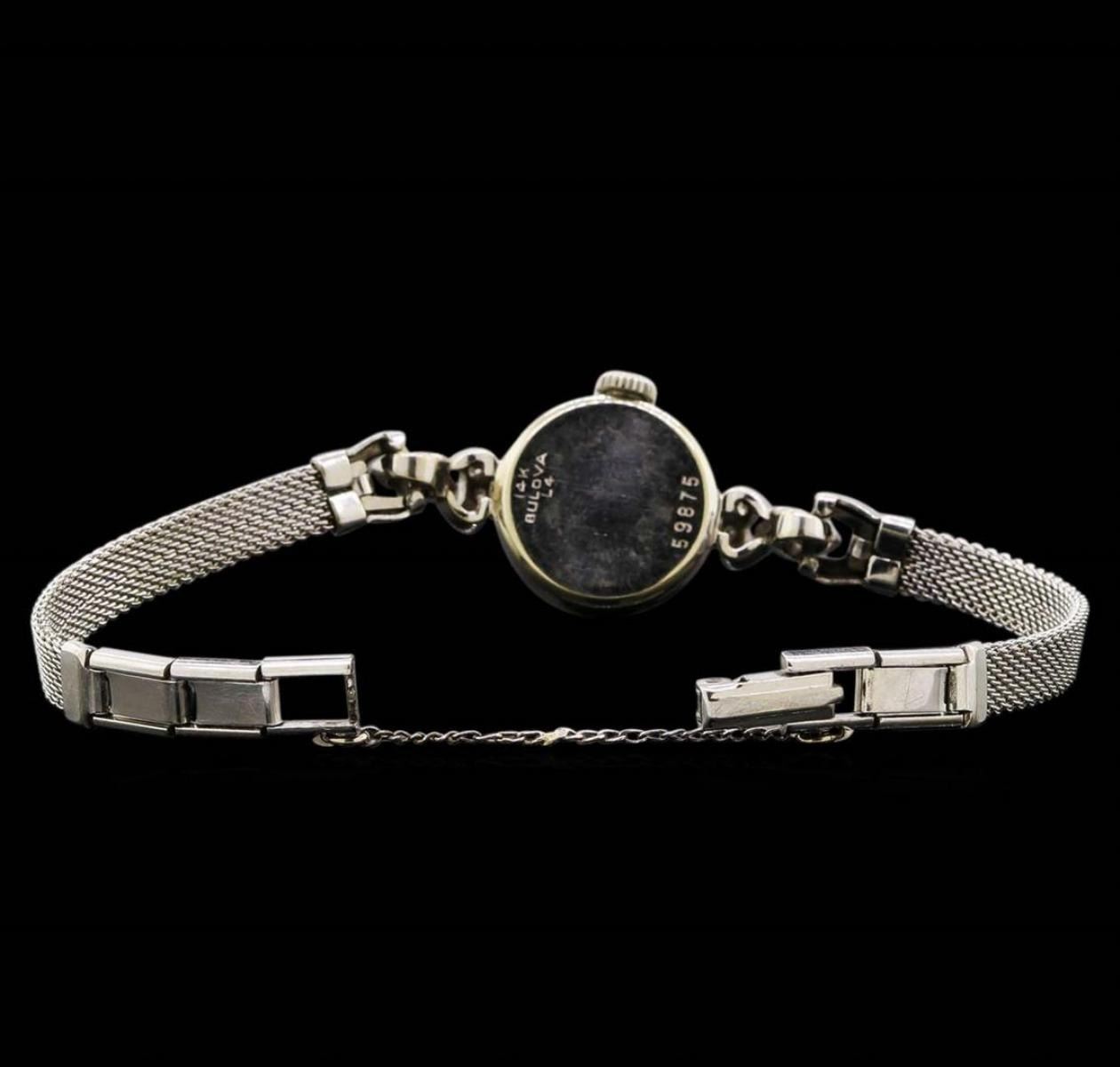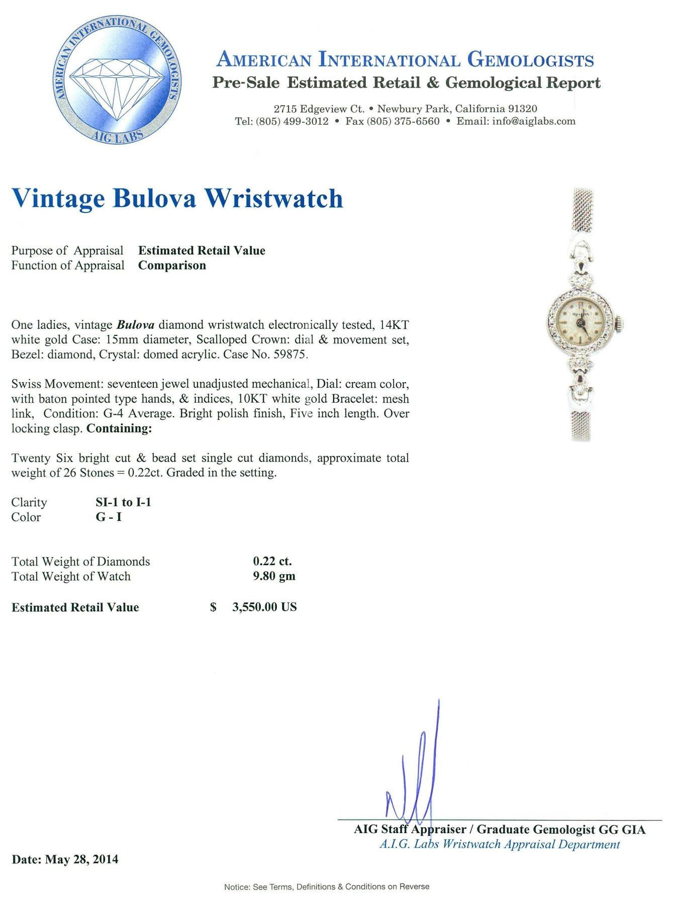 One ladies, vintage Bulova diamond wristwatch electronically tested, 14KT white gold Case: 15mm diameter, Scalloped Crown: dial & movement set, Bezel: diamond, Crystal: domed acrylic. Case No. 59875.Swiss Movement: seventeen jewel unadjusted mechanical, Dial: cream color, with baton pointed type hands, & indices, 10KT white gold Bracelet: mesh link, Condition: G-4 Average. Bright polish finish, Five inch length. Over locking clasp. Containing: Twenty Six bright cut & bead set single cut diamonds, approximate. Total Weight of 26 Stones = 0.22ct. Graded in the setting. Clarity: SI-1 to I-1. Color: G - I. Total Weight of Diamonds 0.22ct. Total Weight of Watch 9.80 grams. AIG Appraised.