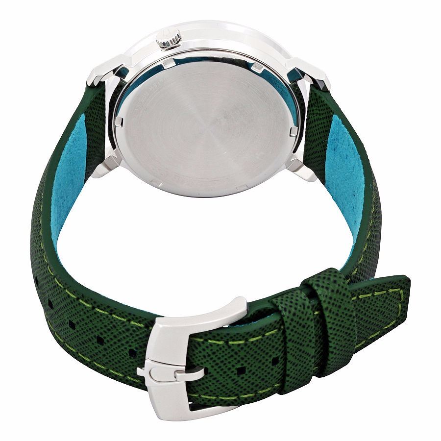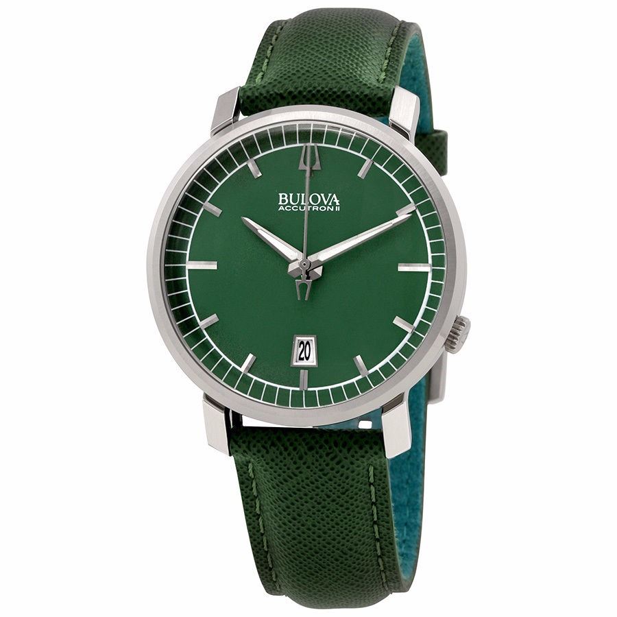 Stainless steel case with a green leather strap. Fixed stainless steel bezel. Green dial with silver-tone hands and index hour markers. Minute markers around the outer rim. Dial Type: Analog. Date display at the 6 o'clock position. Quartz movement. Scratch resistant mineral crystal. Pull / push crown. Solid case back. Case size: 41 mm. Case thickness: 11 mm. Round case shape. Band width: 20 mm. Tang clasp. Water resistant at 30 meters / 100 feet. Functions: date, hour, minute, second. Dress watch style. Bulova Accutron II Green Dial Green Leather Watch