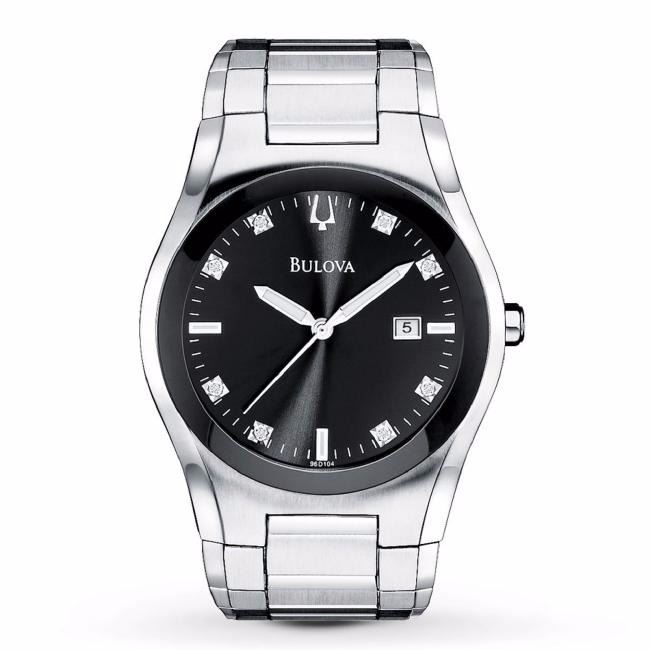 Dress watch, Three-hand Japanese quartz movement displaying polished gunmetal hour and minute hands with luminous accents and polished sweep seconds, 8 genuine diamond hour markers, Applied and polished gunmetal 'Bulova' logo at 12, Polished gunmetal hour-batons with luminescent fill mark quarter hours, White indices mark outer minute track, Analog date display at 3, Brushed and polished silver-tone stainless steel integrated case with octagon-shaped crown, Stainless steel caseback, Water resistant