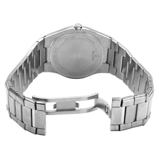 Dress watch, Three-hand Japanese quartz movement displaying polished gunmetal hour and minute hands with luminous accents and polished sweep seconds, 8 genuine diamond hour markers, Applied and polished gunmetal 'Bulova' logo at 12, Polished gunmetal hour-batons with luminescent fill mark quarter hours, White indices mark outer minute track, Analog date display at 3, Brushed and polished silver-tone stainless steel integrated case with octagon-shaped crown, Stainless steel caseback, Water resistant