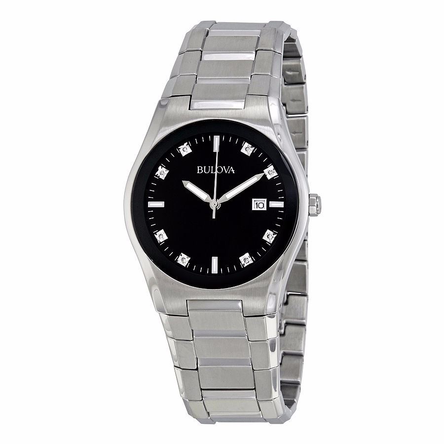 Dress watch, Three-hand Japanese quartz movement displaying polished gunmetal hour and minute hands with luminous accents and polished sweep seconds, 8 genuine diamond hour markers, Applied and polished gunmetal 'Bulova' logo at 12, Polished gunmetal hour-batons with luminescent fill mark quarter hours, White indices mark outer minute track, Analog date display at 3, Brushed and polished silver-tone stainless steel integrated case with octagon-shaped crown, Stainless steel caseback, Water resistant